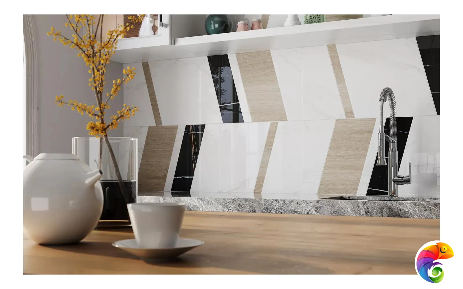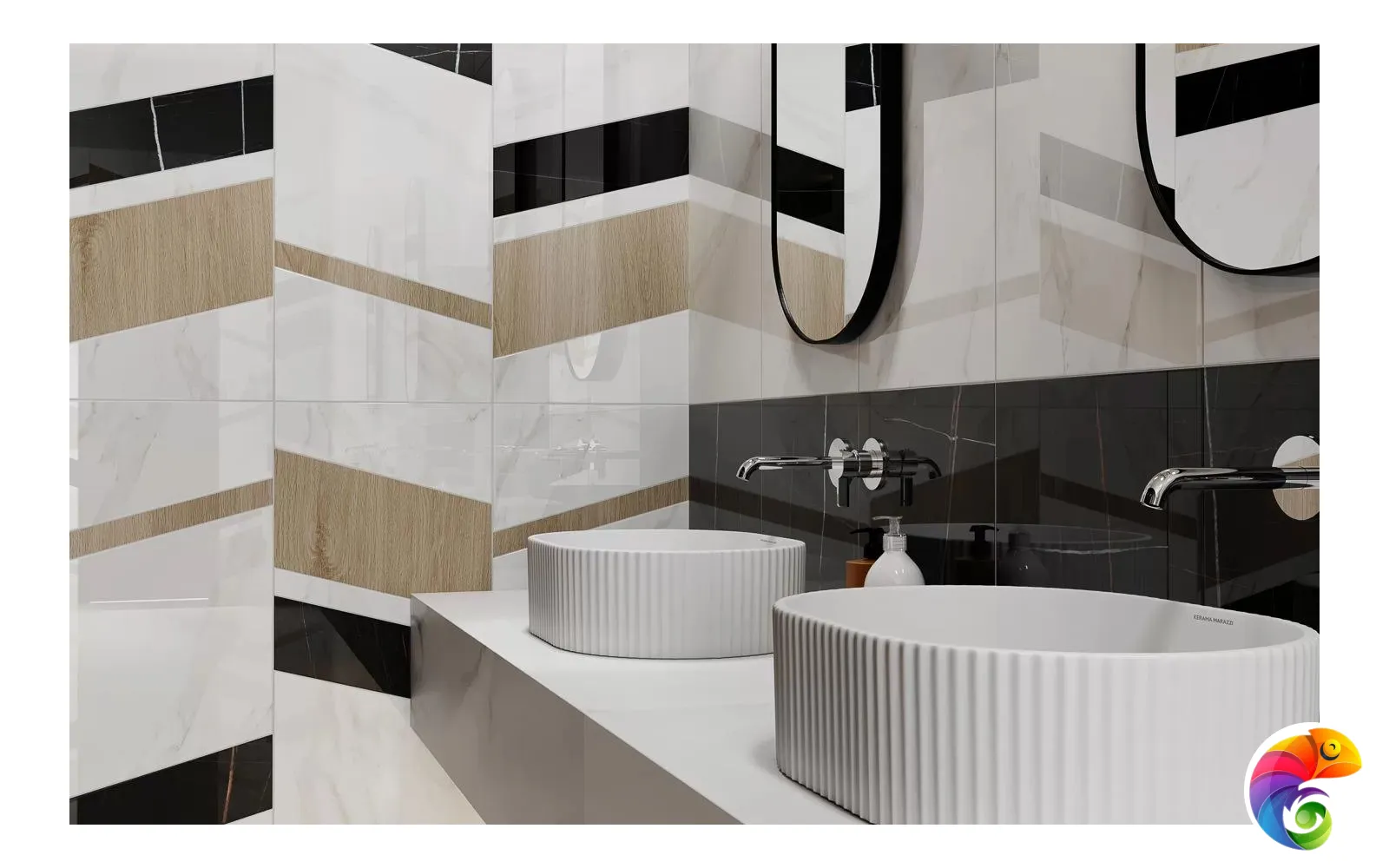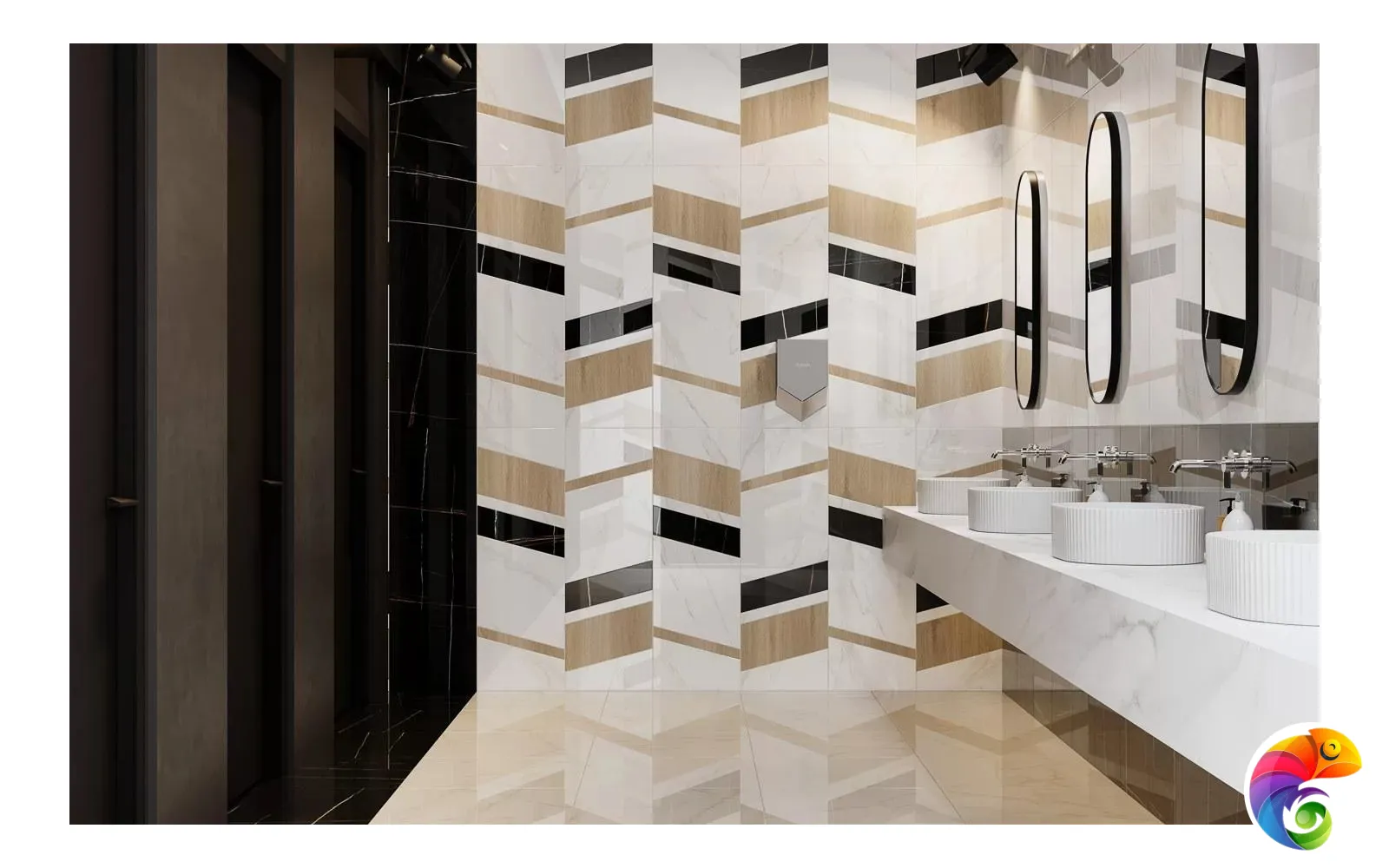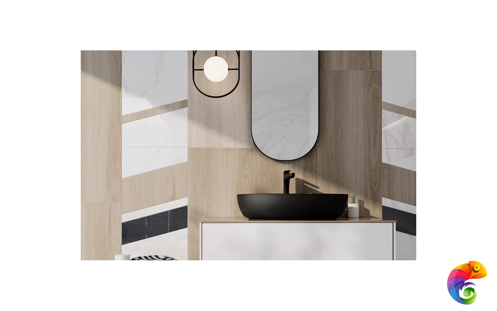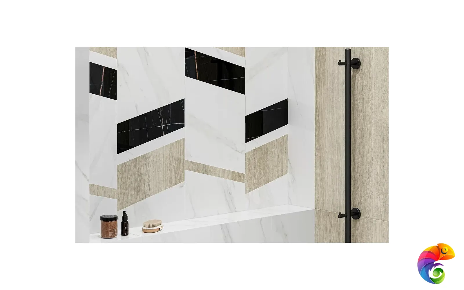 Большая керамическая плитка серии «Бертран» способна визуально расширить пространство маленького санузла посредством необычных оптических эффектов. Стыкуя наборные декоры разными способами, добиваясь рисунка W-образных линий, можно достичь иллюзии объёмных фигур. Необычная картинка меняет наше восприятие, и взгляд не может автоматически определить границы помещения.