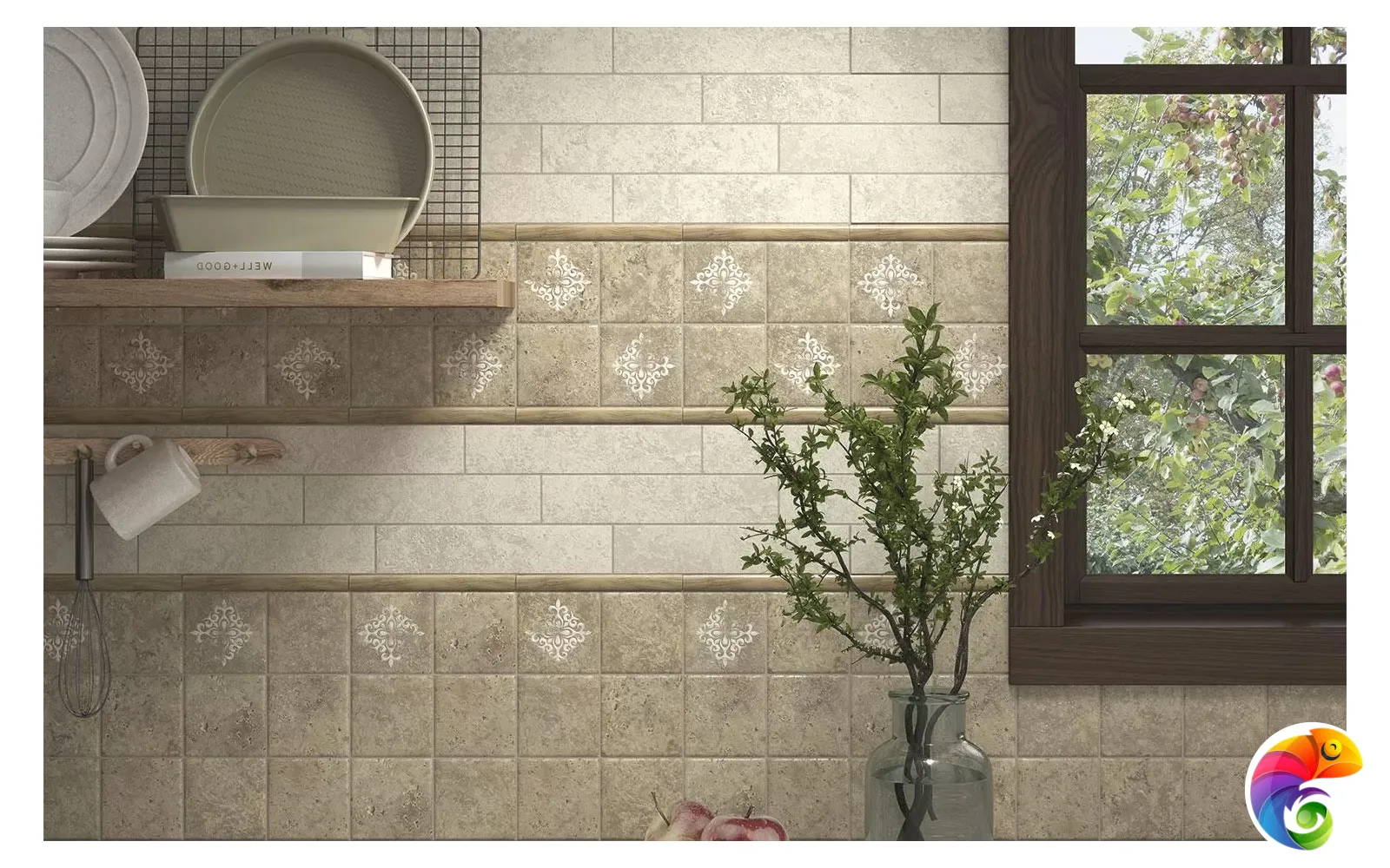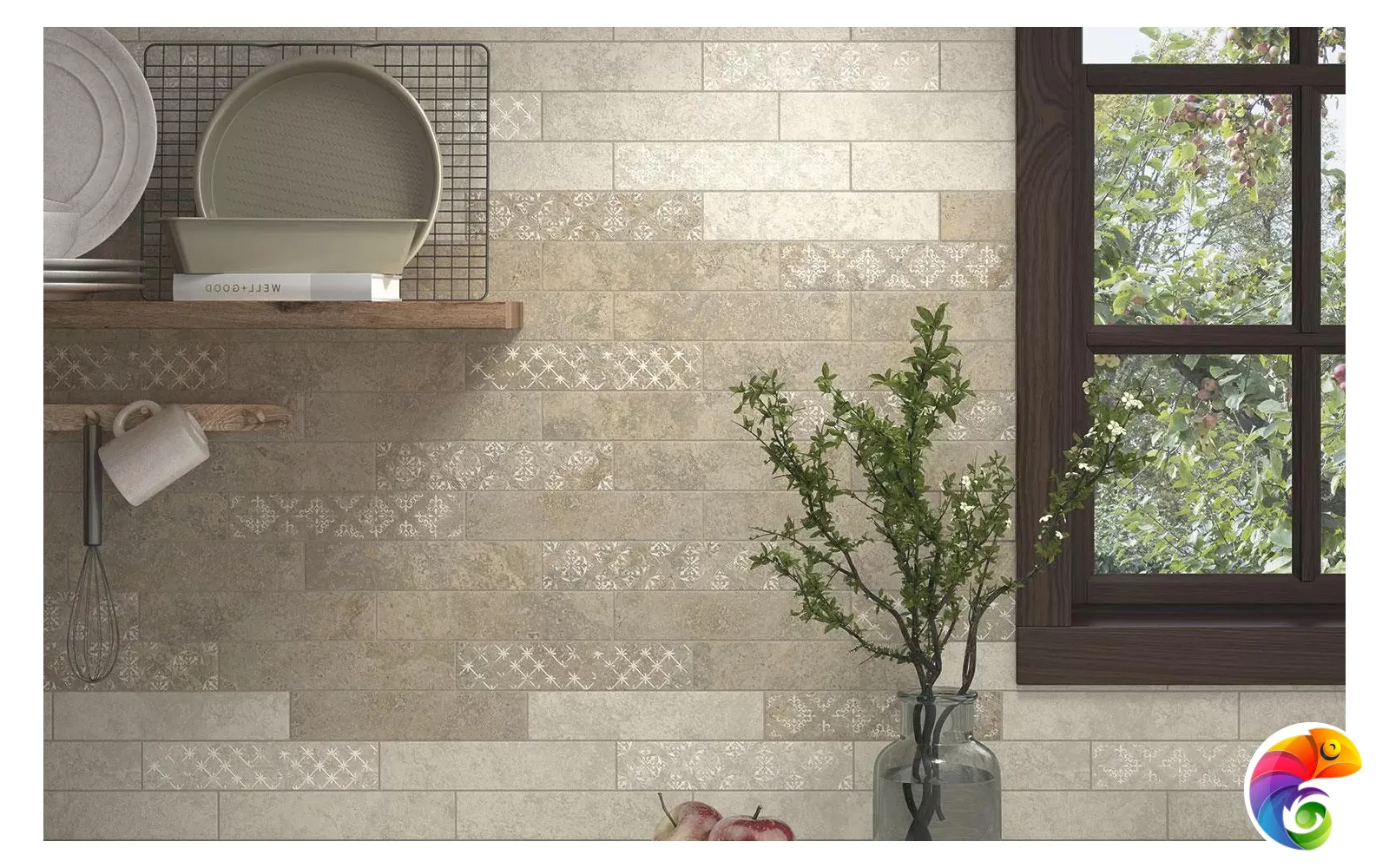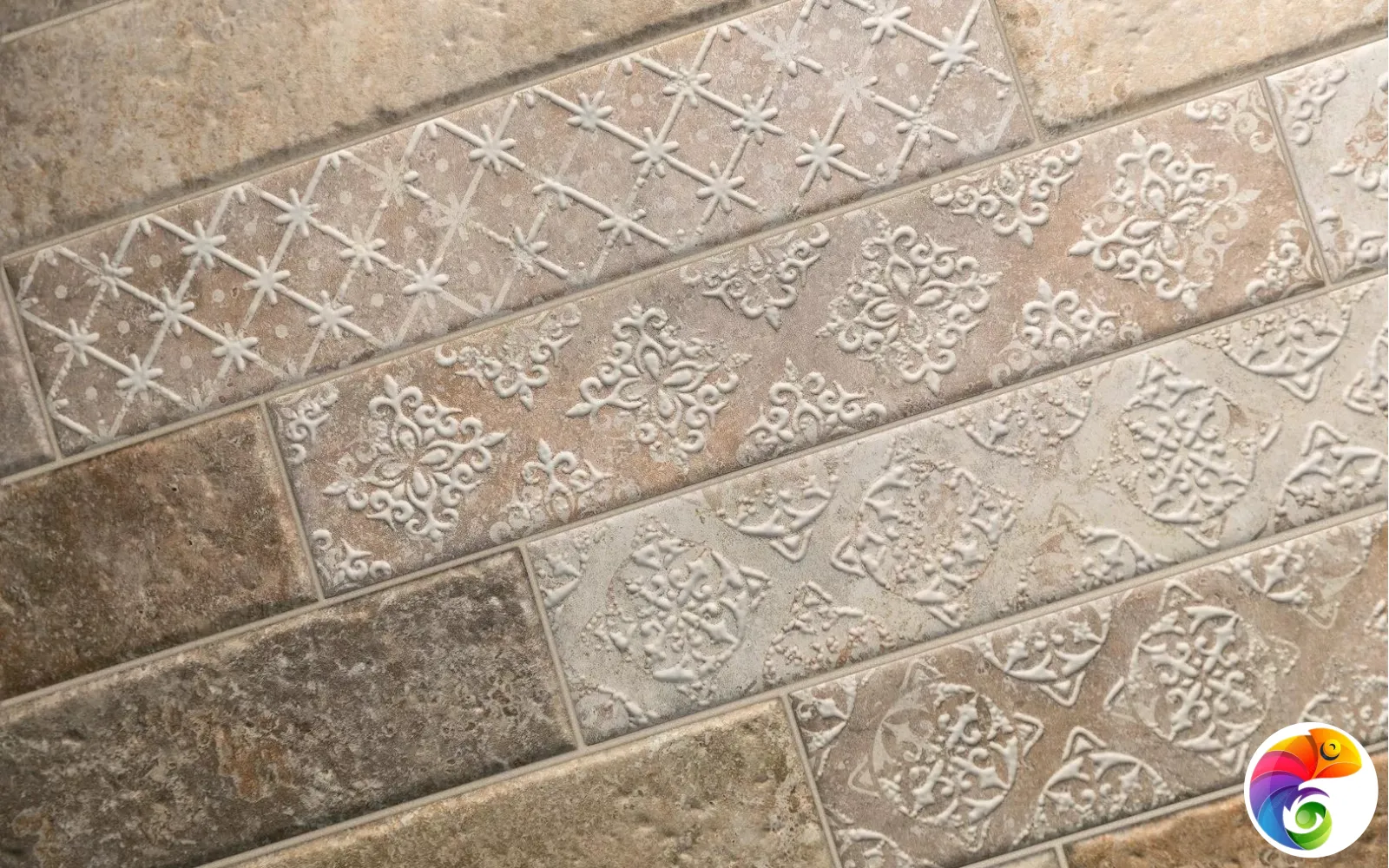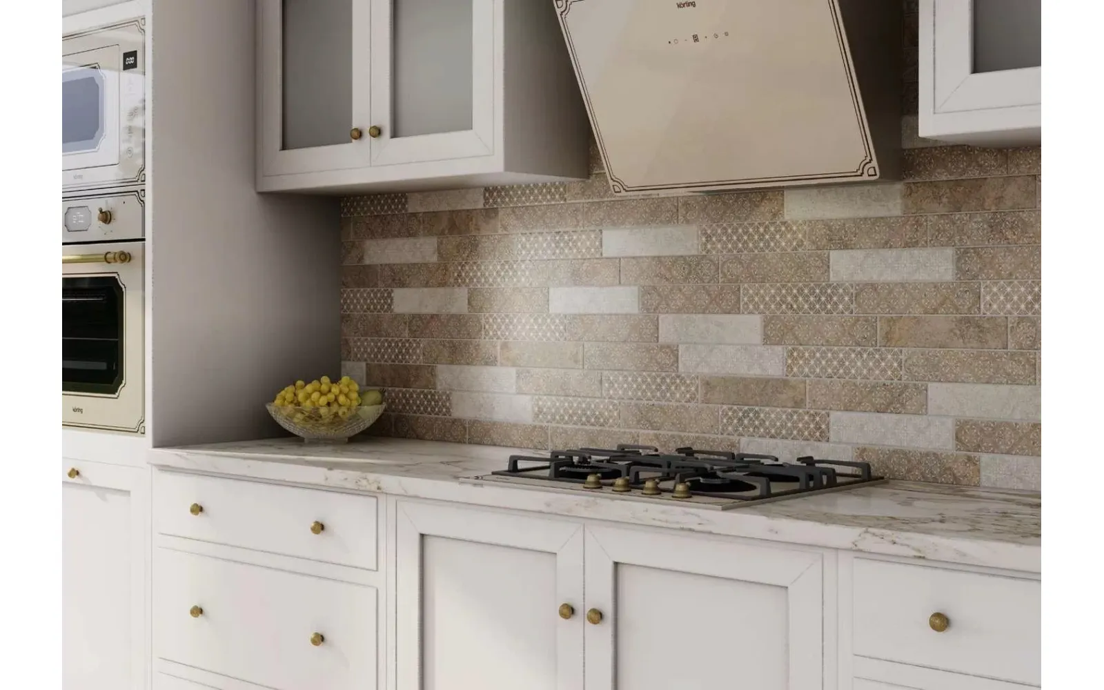 Этот керамический кирпич выглядит рукотворным: его форма с едва неровными краями и живые оттенки получены на современной линии — но с тёплым ощущением штучного производства. Декоры несут ту же эстетику и дополнительно украшены классическими орнаментами, выполненными с небольшим рельефом.