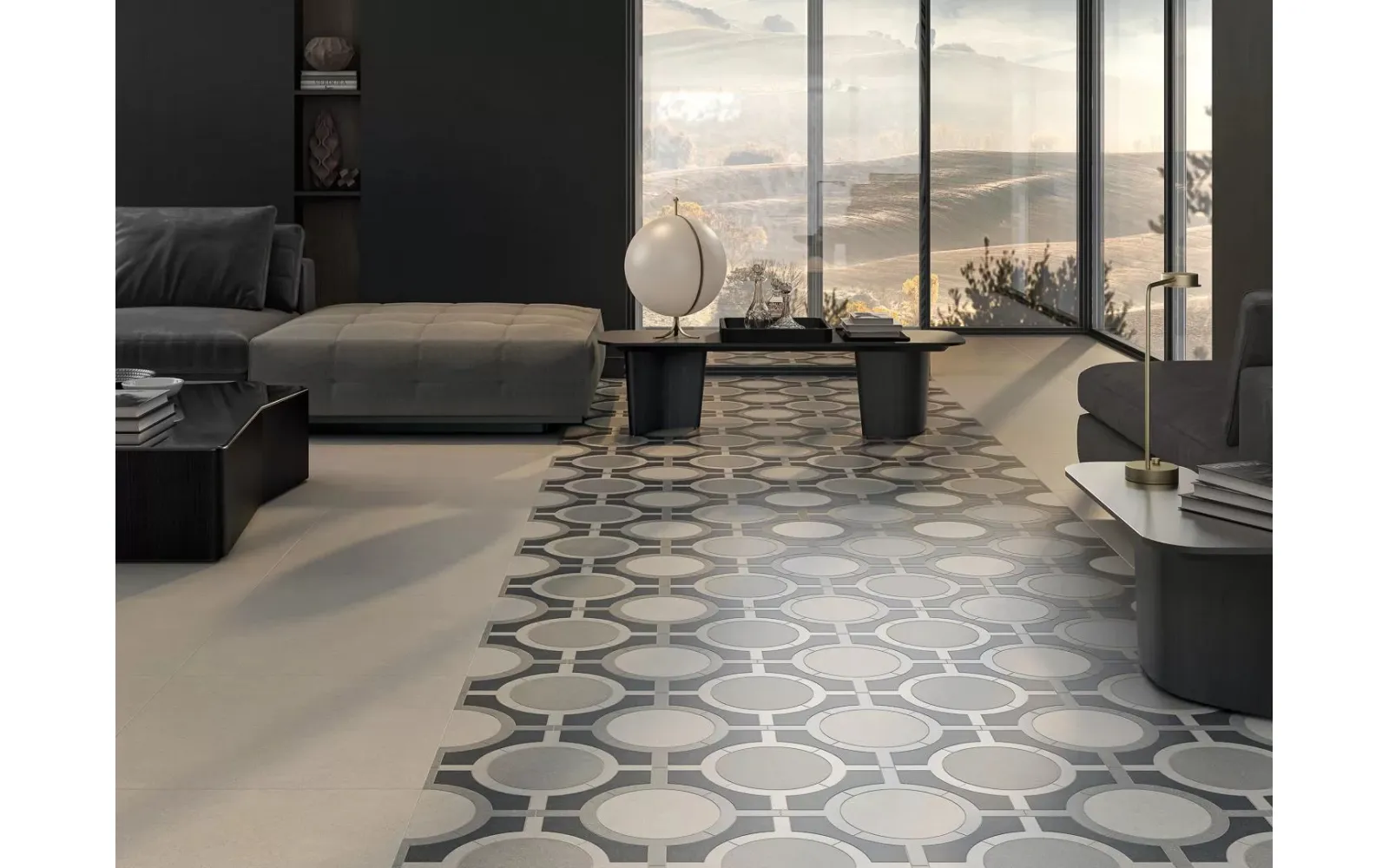 Интересная форма наборных декоров, а также удлиненные мозаичные чипы со скруглёнными углами делают «Джиминьяно» отличным выбором, особенно когда на полу нужно создать оригинальную раскладку с эстетикой камня.