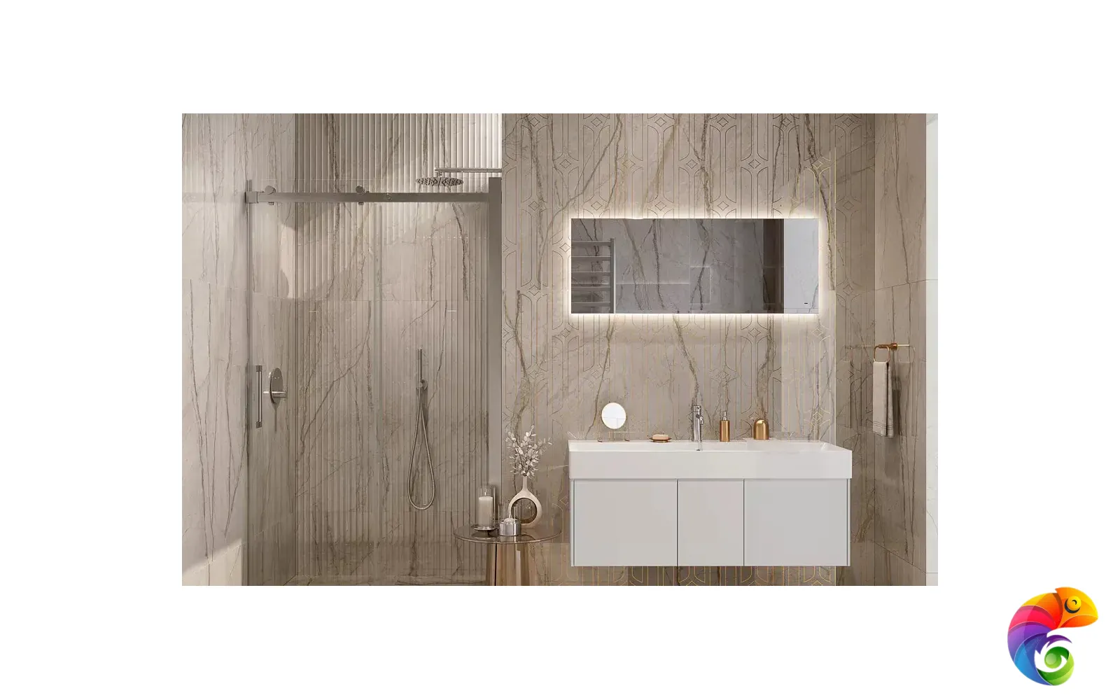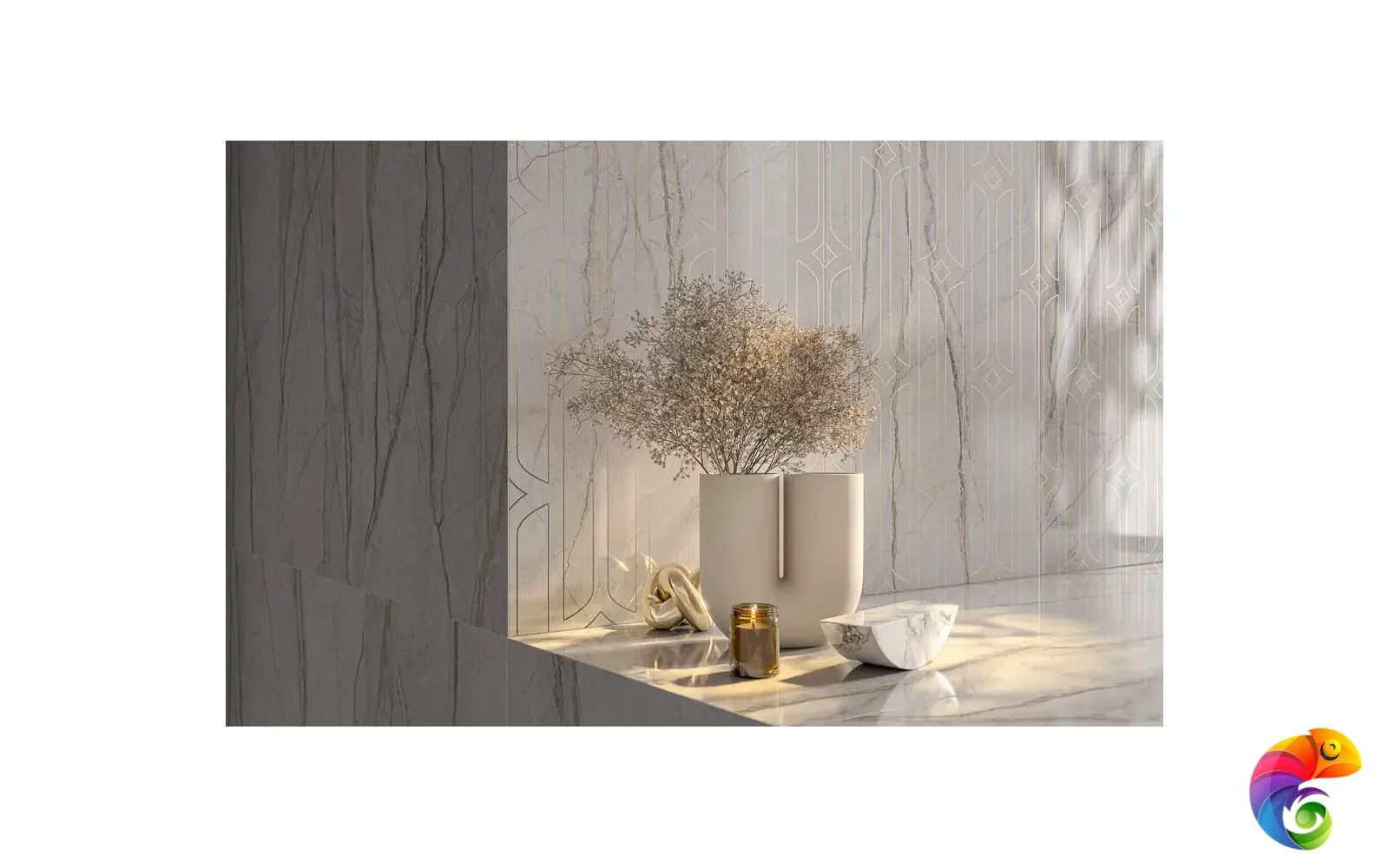 Дополнить интерьер помогут декоры и бордюры, представленные в серии. Они украшены тонкими золотыми линиями геометрического узора. Нанесённый поверх природной каменной текстуры, орнамент придаёт покрытию особую ценность. Нарезная мозаика представлена в двух оттенках и вариантах исполнения: наборная с орнаментальным рисунком или нарезная с геометрическим мотивом.