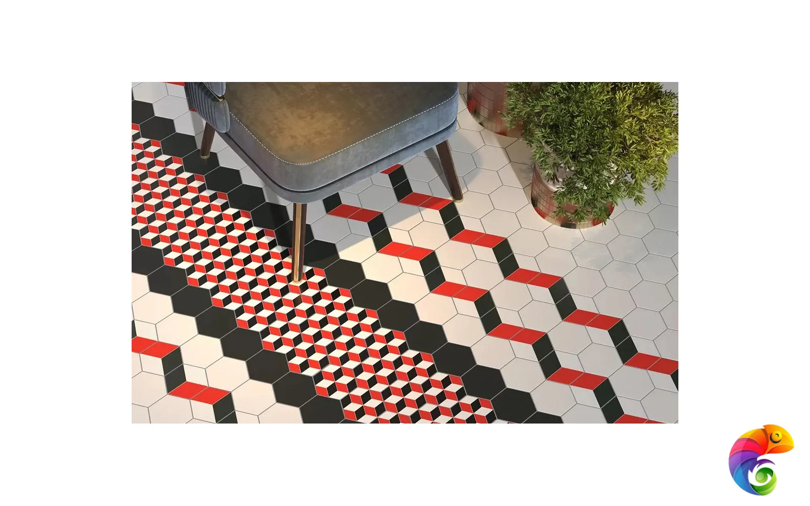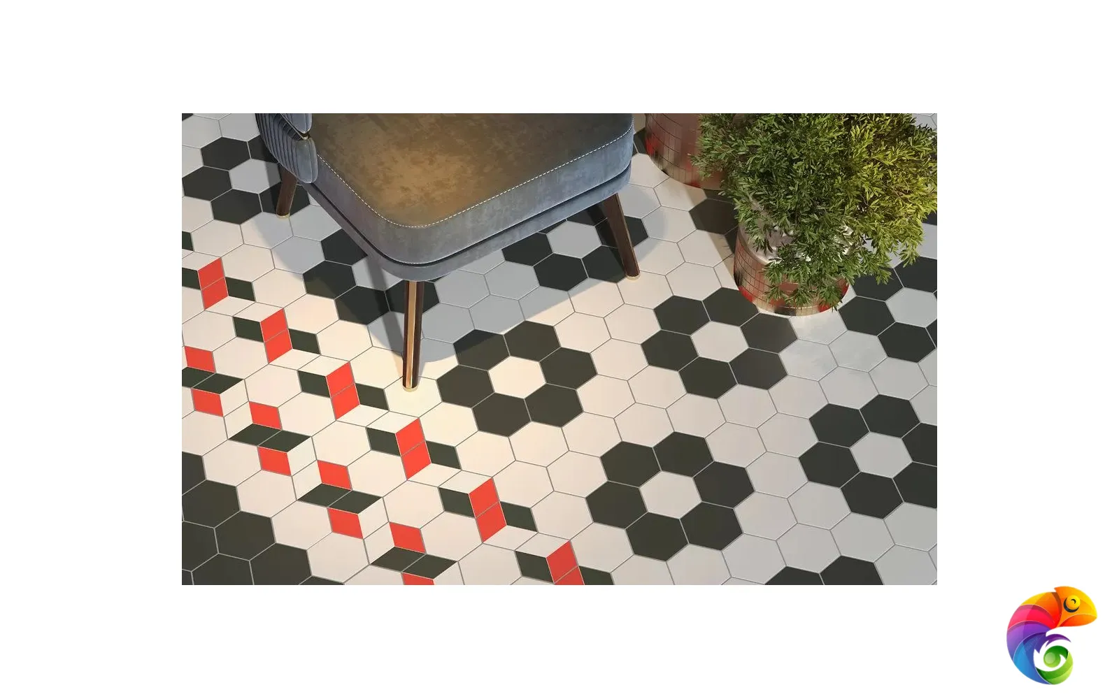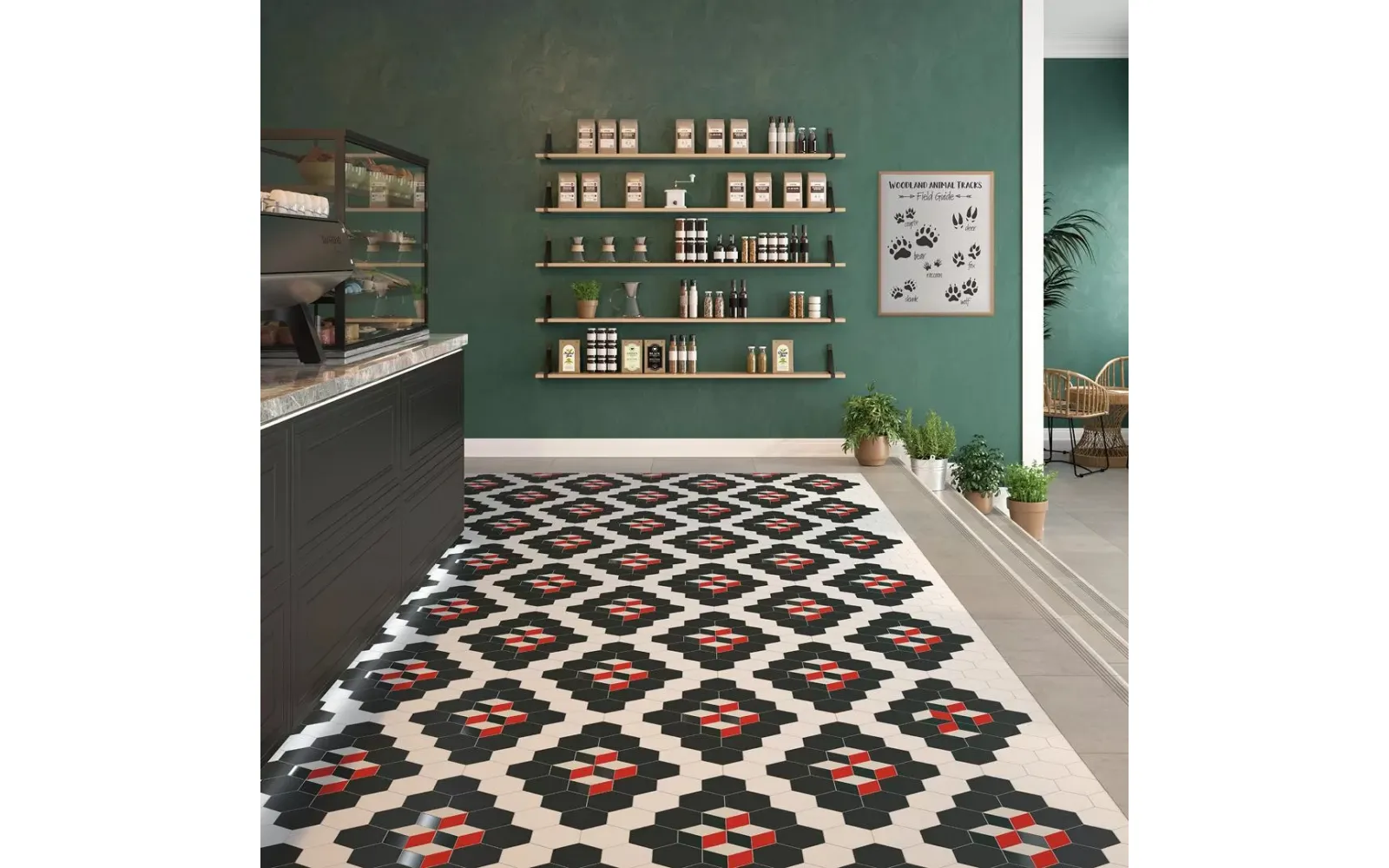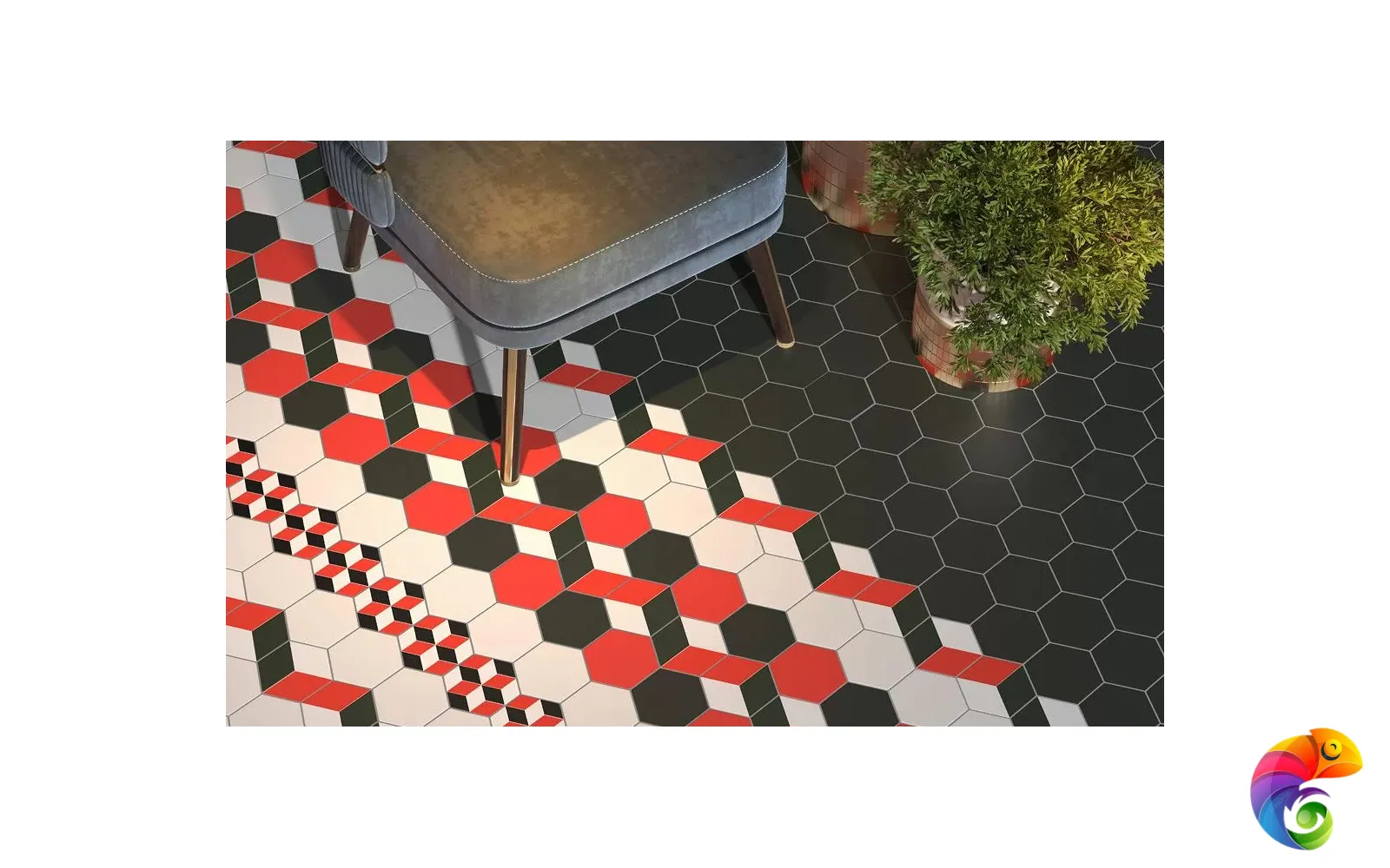 В случае с серией «Кальсада» все стилизованные соты керамогранита закреплены на сетке, образуя удобный для работы формат 37×31 см. Его можно разнообразить, добавляя в раскладку штучные декоры, часть из которых решена в серо-чёрной гамме, а другая содержит дополнительный красный. Детали паттерна подчёркнуты при помощи блестящего объёмного состава, что делает рисунок декоров ещё выразительнее. В случае выбора такого материала в качестве керамогранита для кухни подобная детализация узоров создаст интересный акцент.