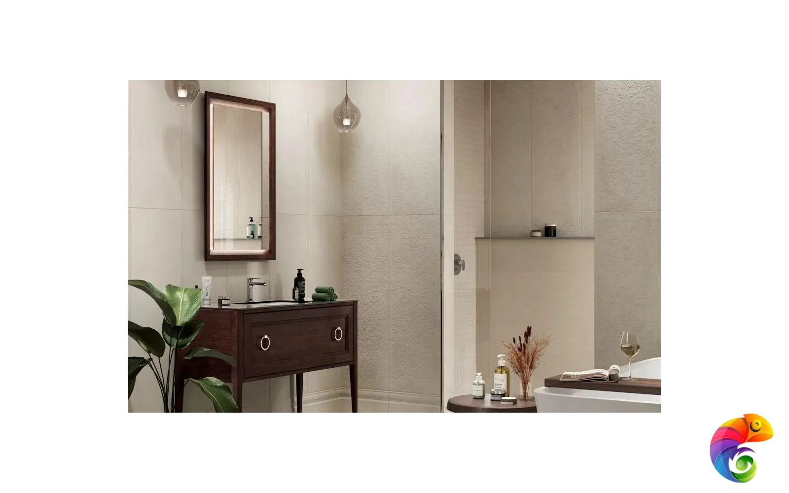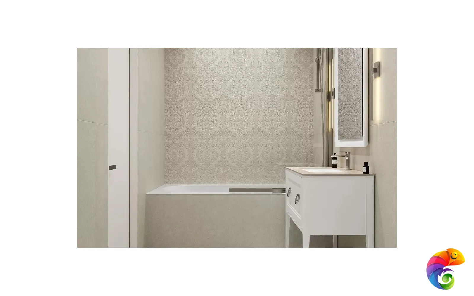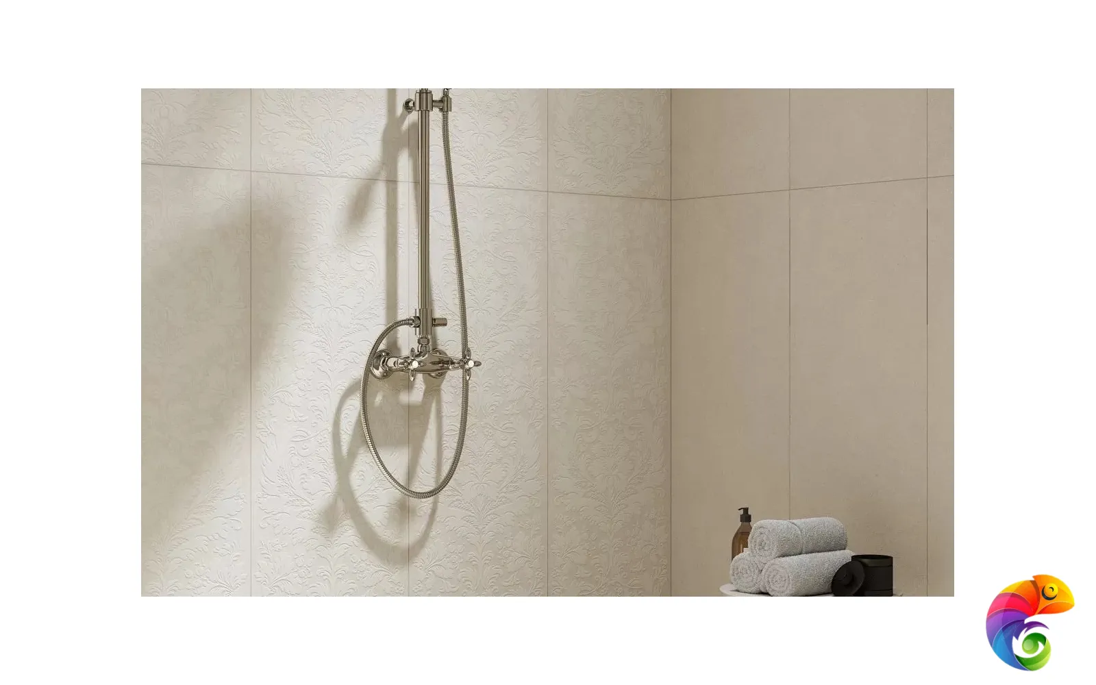 Серия «Монсеррат» позволяет выполнить зонирование пространства изящно и со вкусом. К примеру, душевную зону или стену за унитазом можно облицевать плиткой под мозаику, а стену над ванной выложить керамической плиткой с узором. Либо декором можно украсить пространство вокруг зеркала — эта область обычно имеет подсветку, и красота рельефа серой или бежевой плитки будет хорошо заметна.