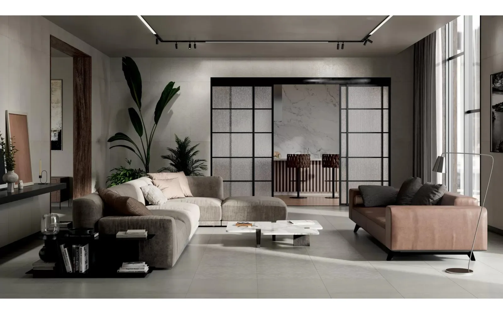 Крупные форматы настенной серой и бежевой плитки 40×120 см серии «Монсеррат» исполнены в гладком базовом варианте и с объёмным рисунком. В дополнение к ним предлагаются структурированные бордюр и плинтус, а также плитка под мозаику (нарезная мозаика). Базовый керамогранит 60×60 для напольной укладки дополняют варианты с узорами типа «дамаск», выполненные с помощью пескоструйной обработки. Наиболее эффектно керамический гранит «Монсеррат» будет смотреться в виде «ковра» по центру помещения.