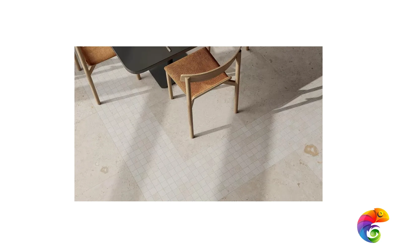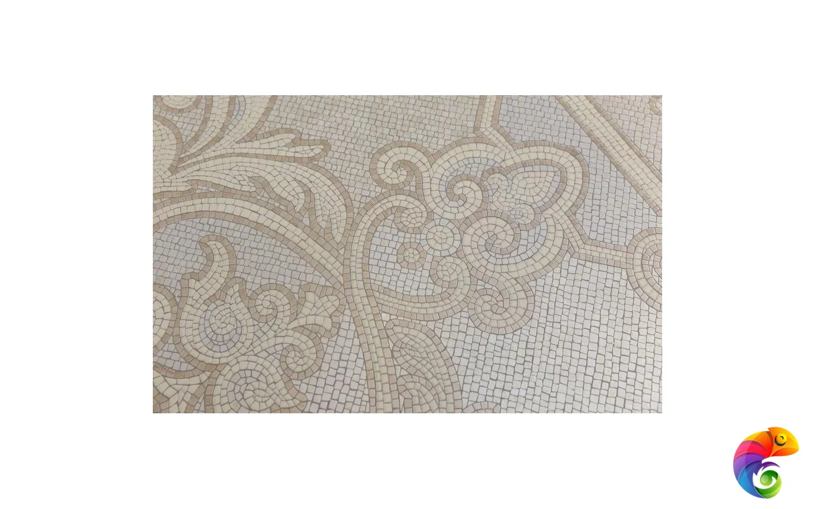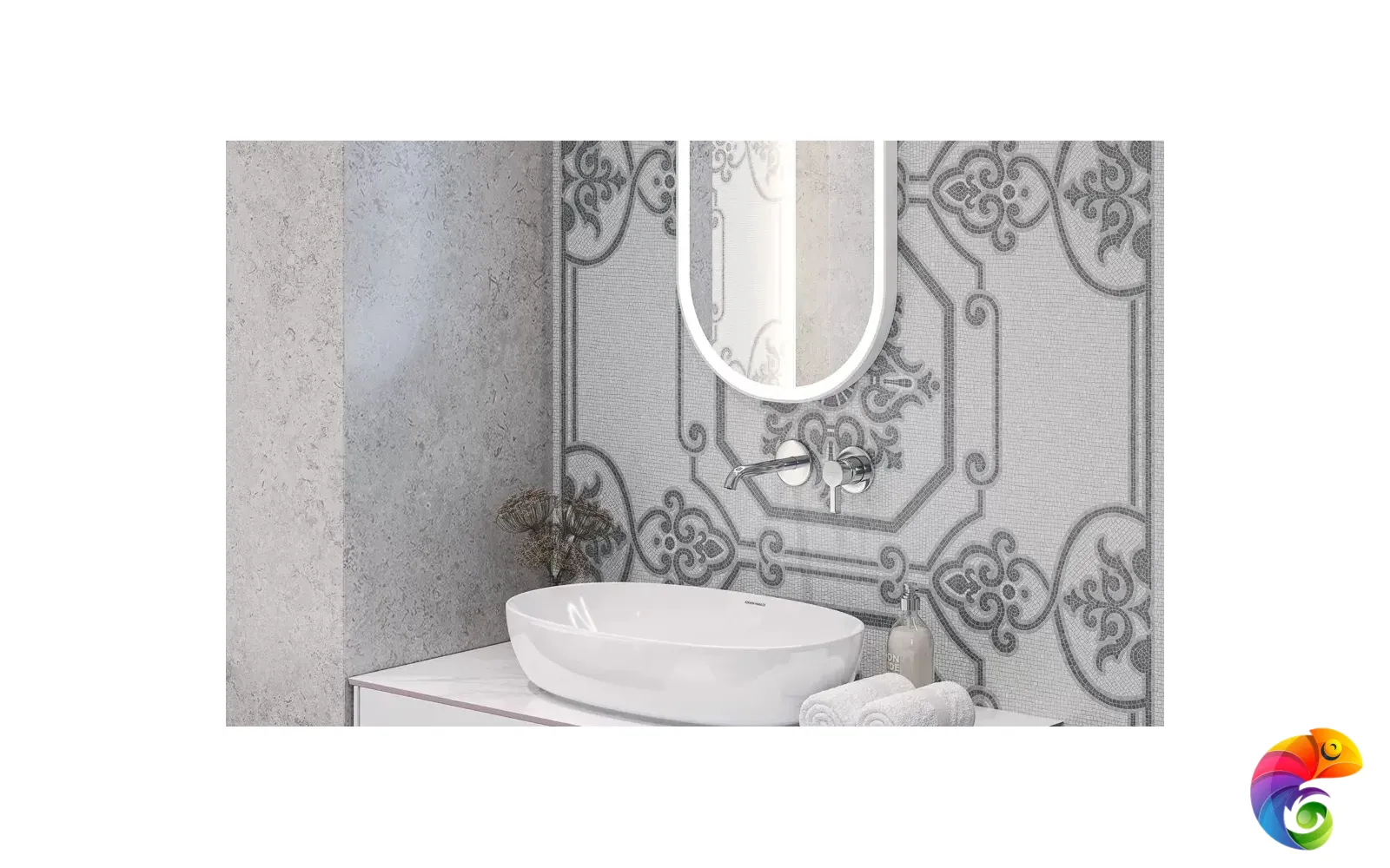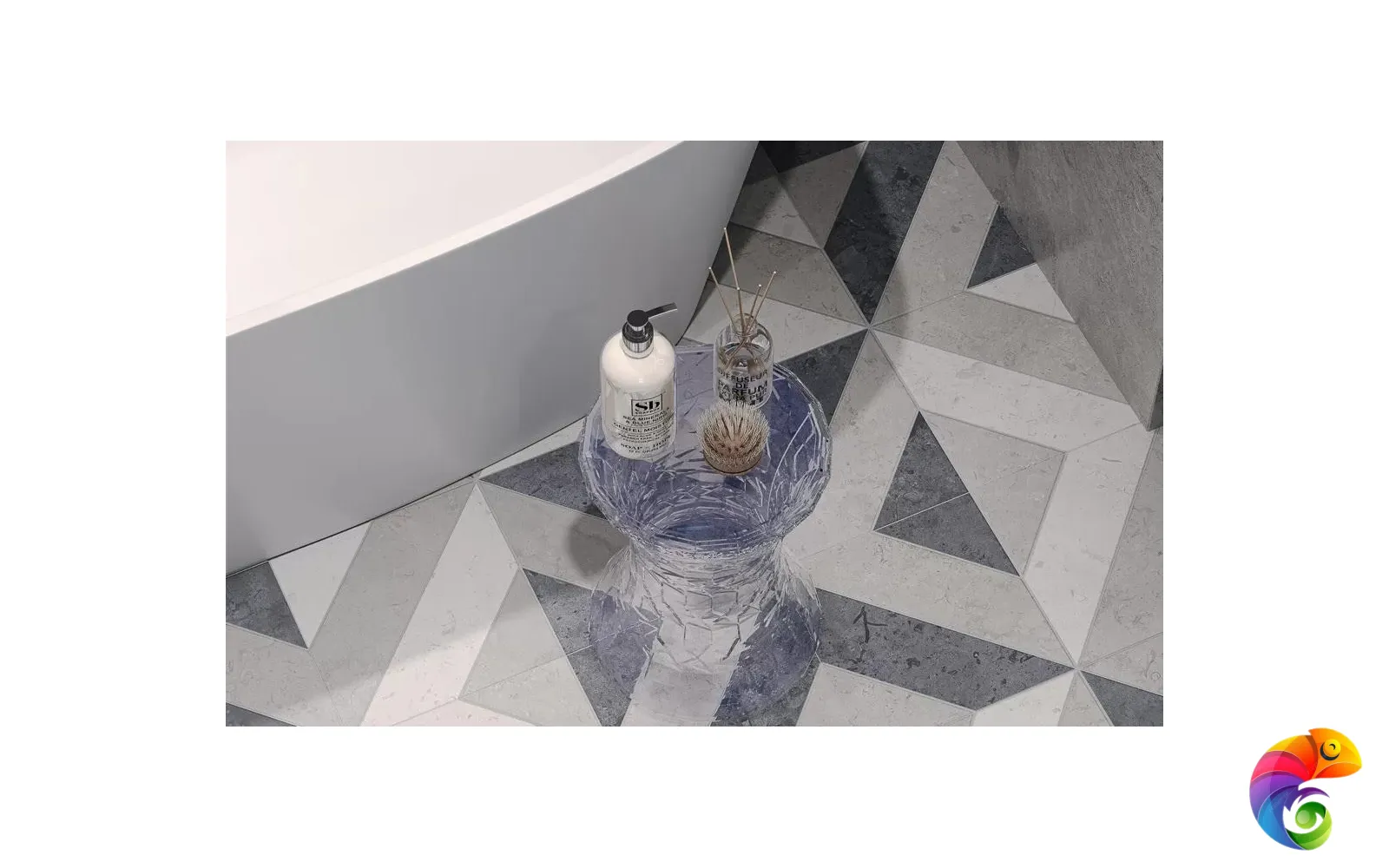 Часть керамических материалов выполнена в формате 60×60: здесь также представлены классические узоры и декоративный элемент, геометрический рисунок которого получен из нескольких цветовых вариаций лаймстоуна с помощью гидроабразивной резки. В этом можно увидеть перекличку с историей данного камня, свойства которого позволяли мастерам покрывать его искусной резьбой и использовать в составе наборных элементов.