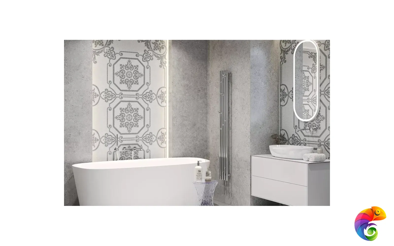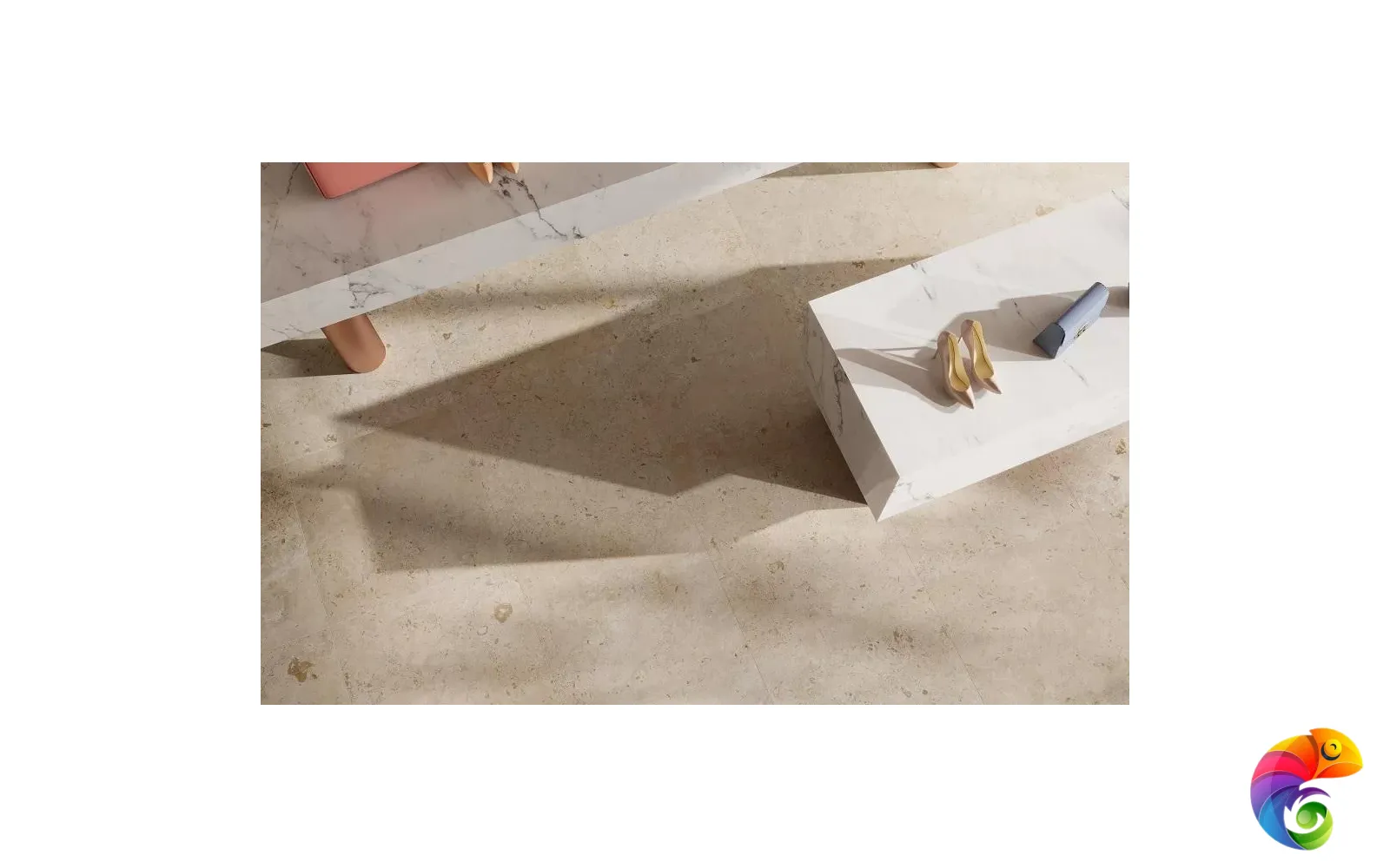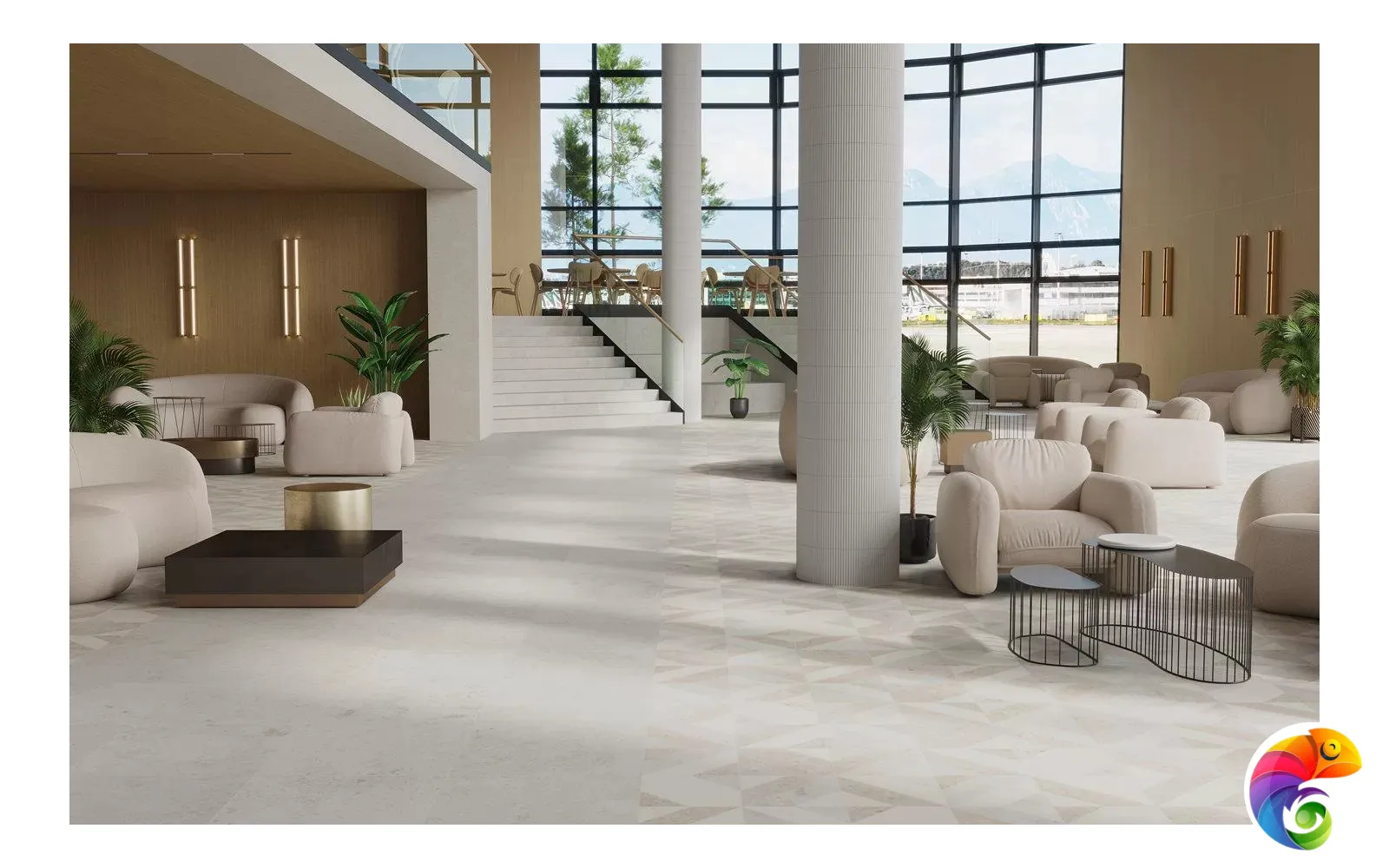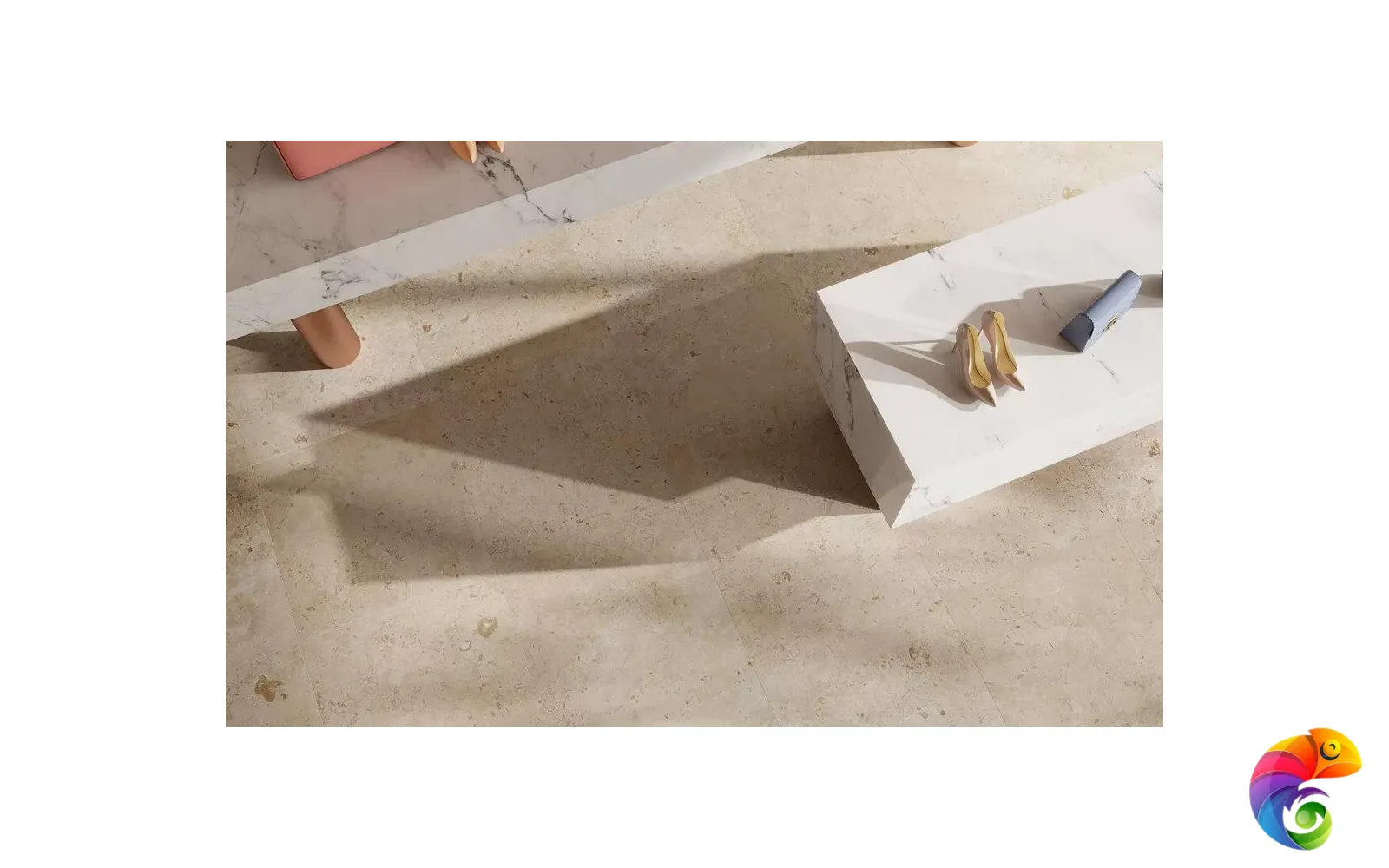 Часть керамических материалов выполнена в формате 60×60: здесь также представлены классические узоры и декоративный элемент, геометрический рисунок которого получен из нескольких цветовых вариаций лаймстоуна с помощью гидроабразивной резки. В этом можно увидеть перекличку с историей данного камня, свойства которого позволяли мастерам покрывать его искусной резьбой и использовать в составе наборных элементов.