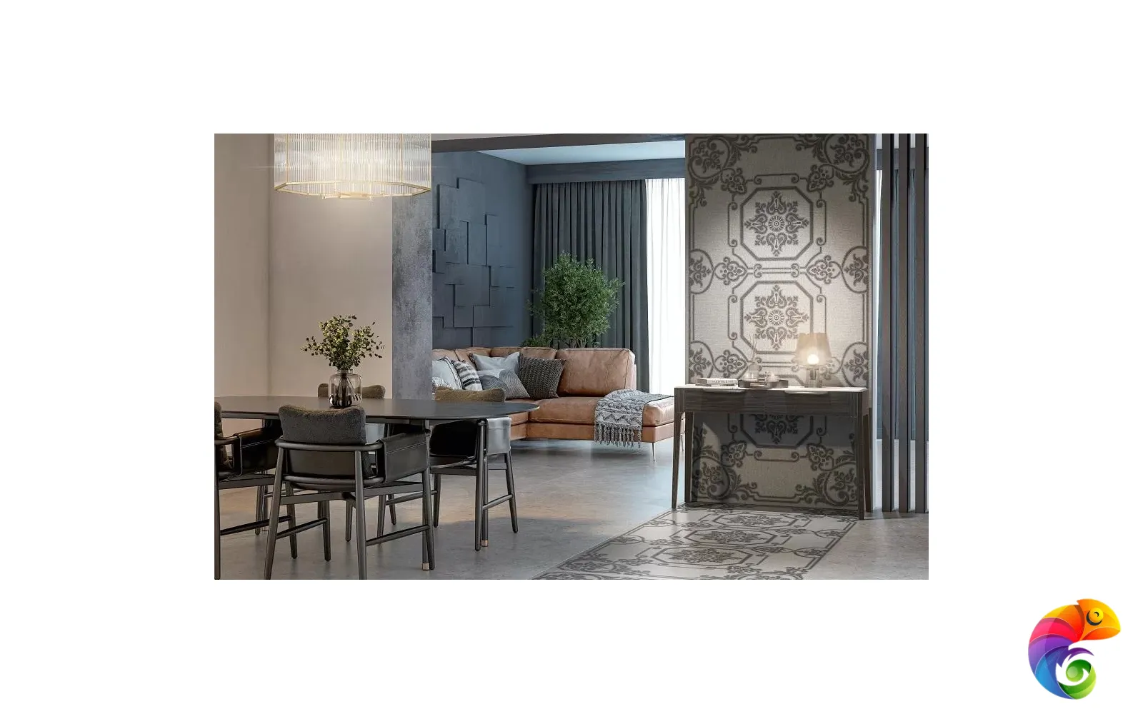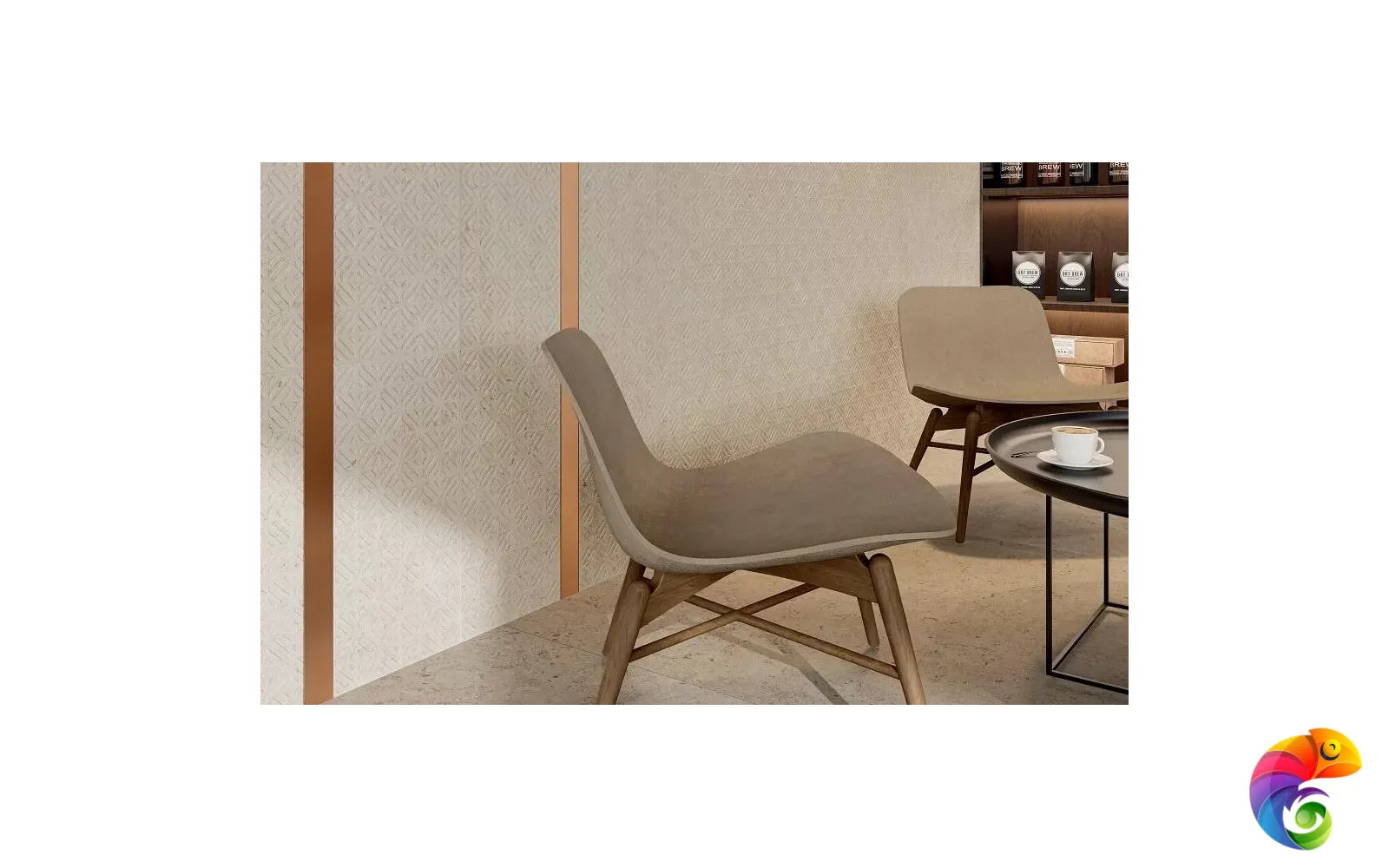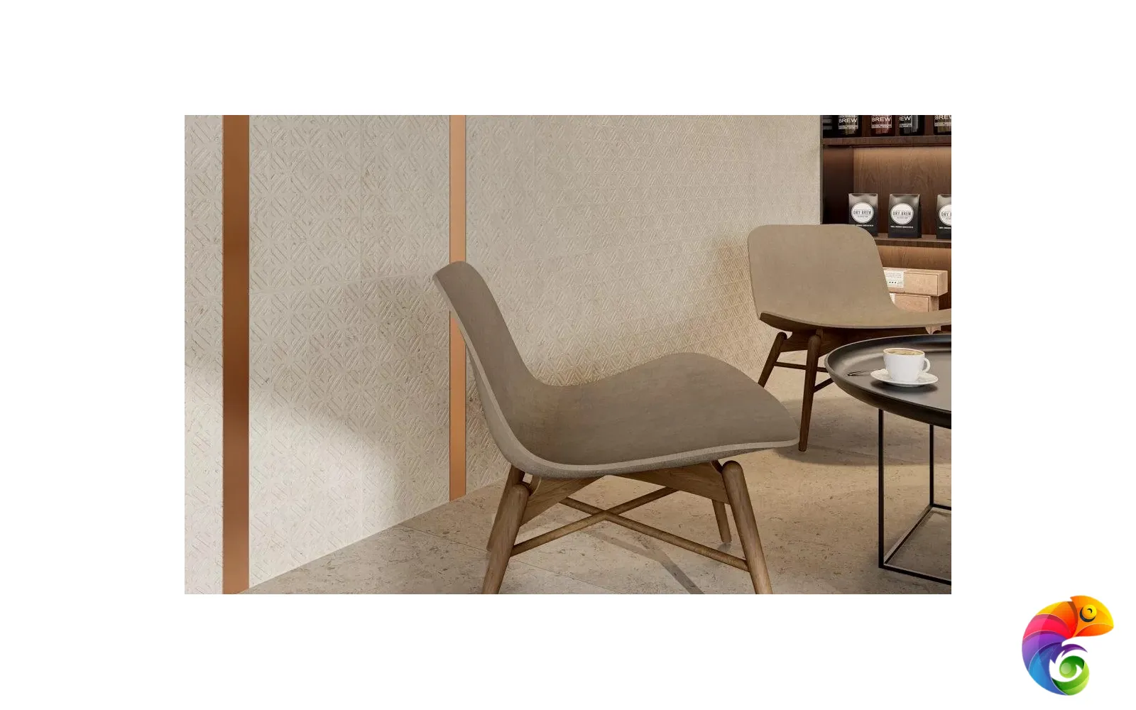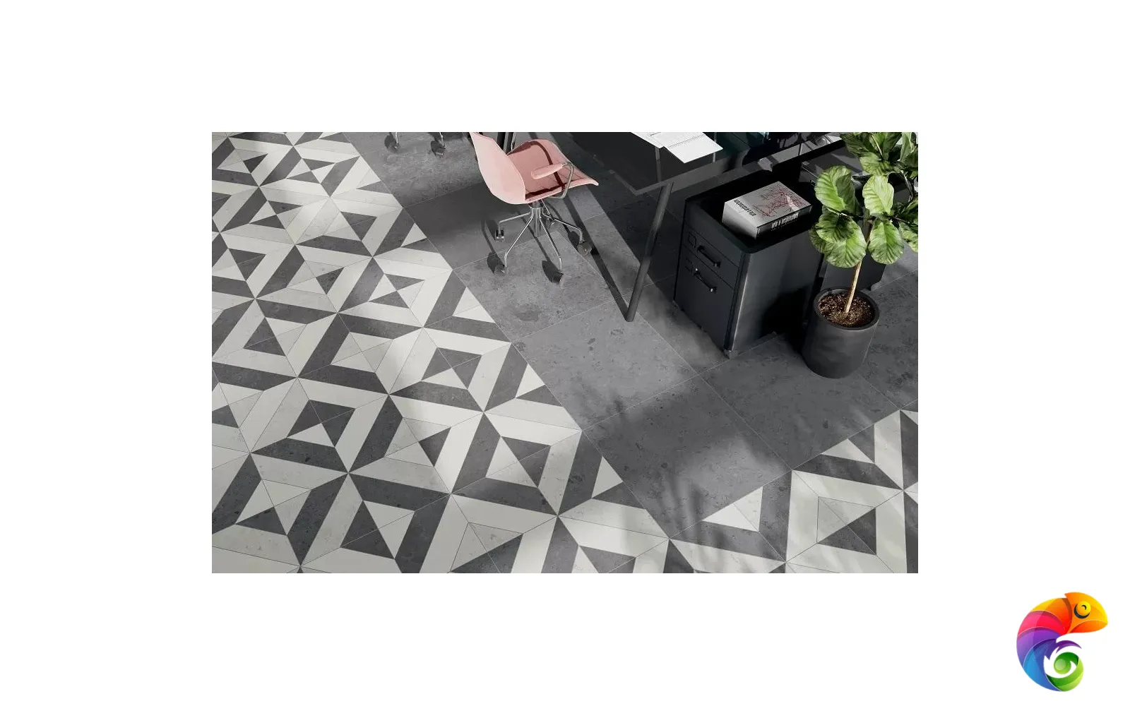 Часть керамических материалов выполнена в формате 60×60: здесь также представлены классические узоры и декоративный элемент, геометрический рисунок которого получен из нескольких цветовых вариаций лаймстоуна с помощью гидроабразивной резки. В этом можно увидеть перекличку с историей данного камня, свойства которого позволяли мастерам покрывать его искусной резьбой и использовать в составе наборных элементов.