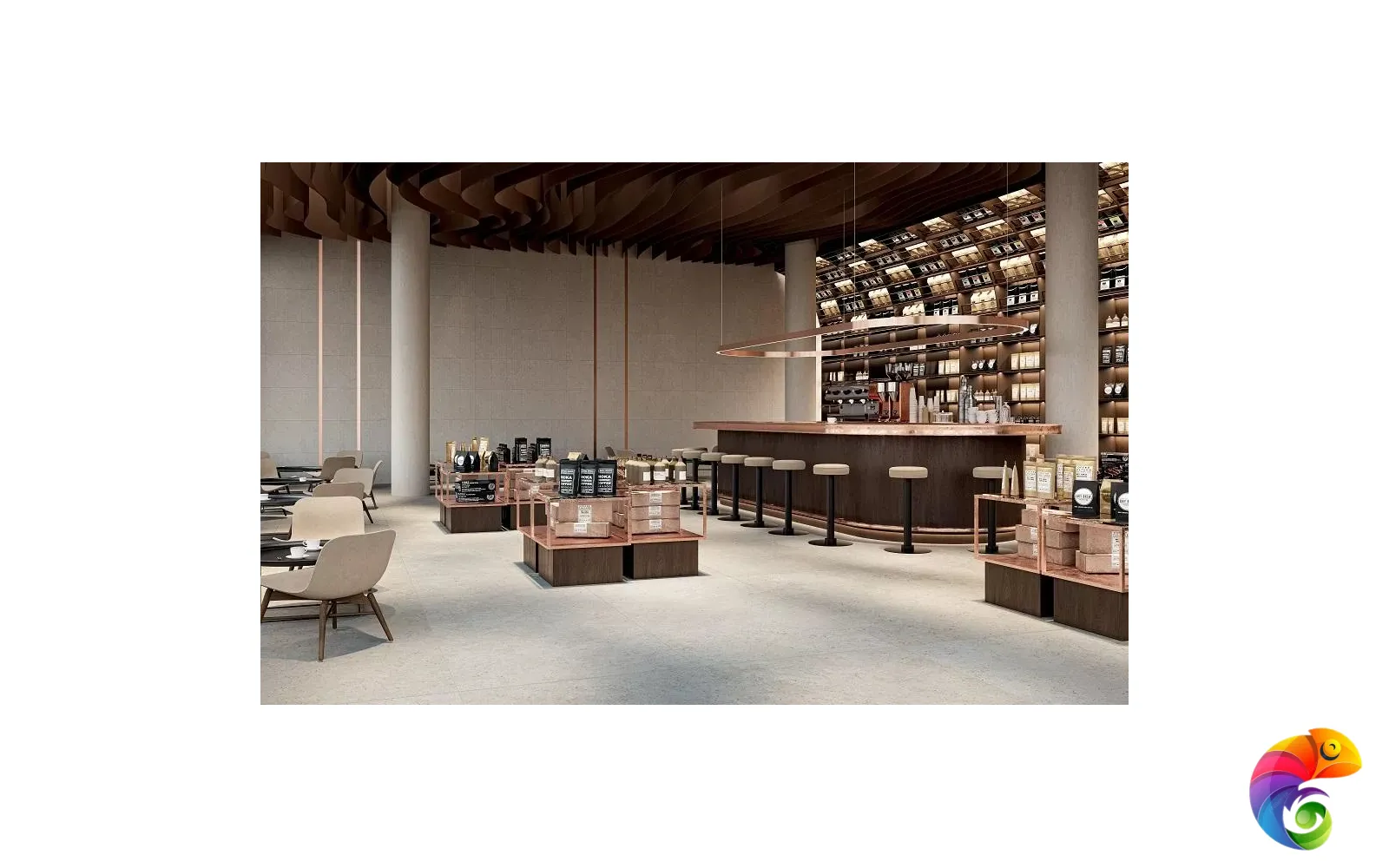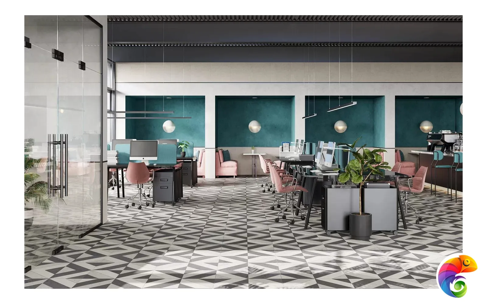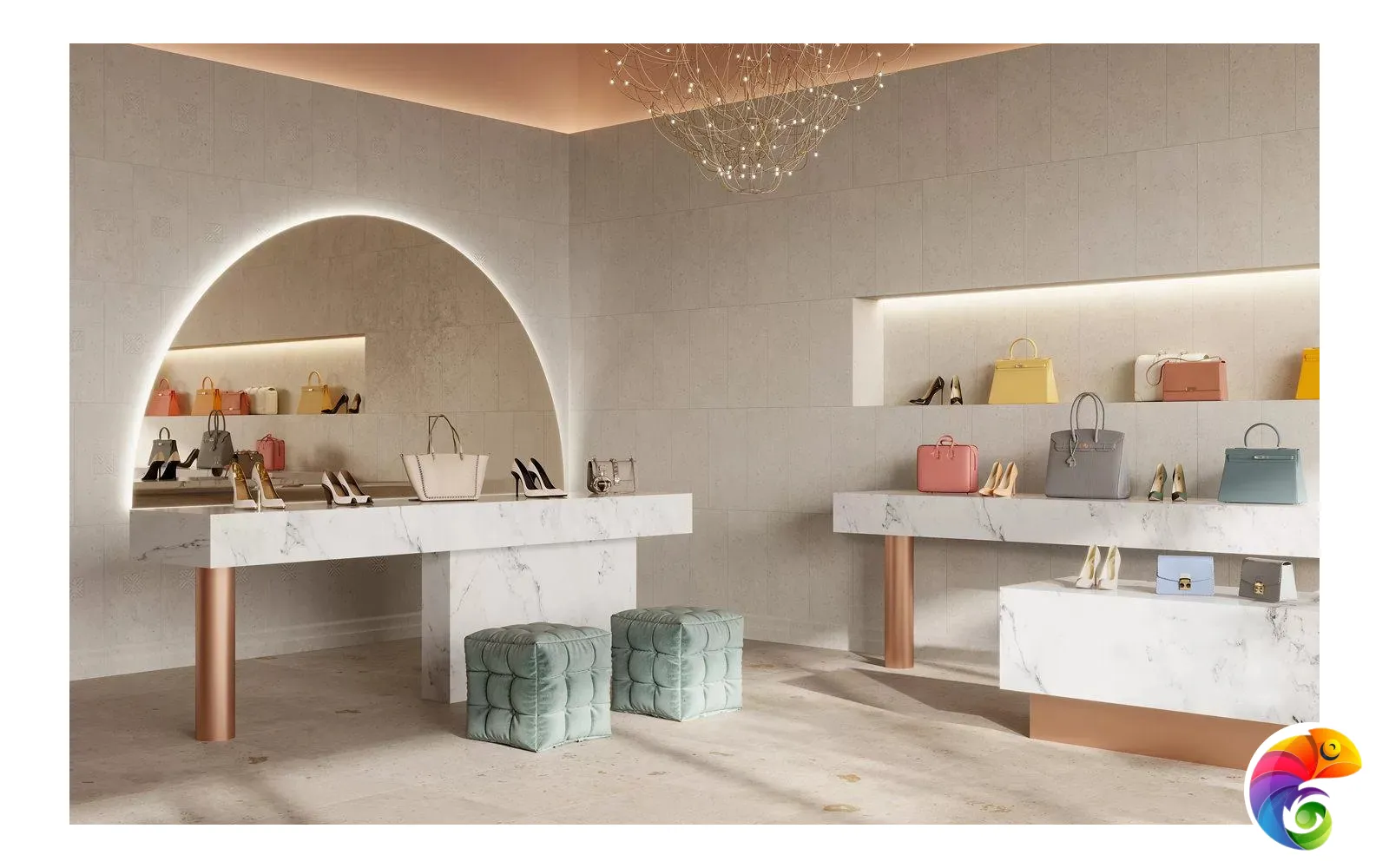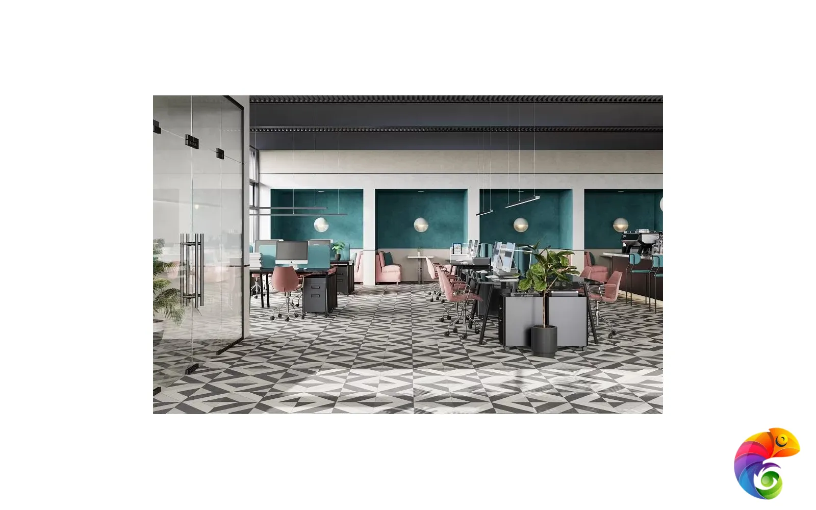 Часть керамических материалов выполнена в формате 60×60: здесь также представлены классические узоры и декоративный элемент, геометрический рисунок которого получен из нескольких цветовых вариаций лаймстоуна с помощью гидроабразивной резки. В этом можно увидеть перекличку с историей данного камня, свойства которого позволяли мастерам покрывать его искусной резьбой и использовать в составе наборных элементов.