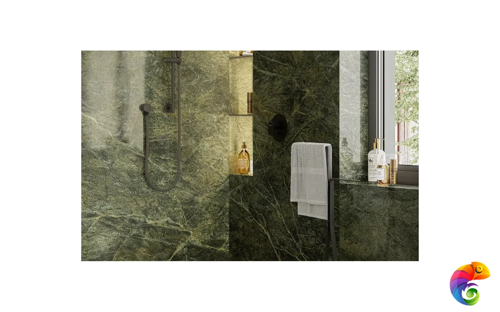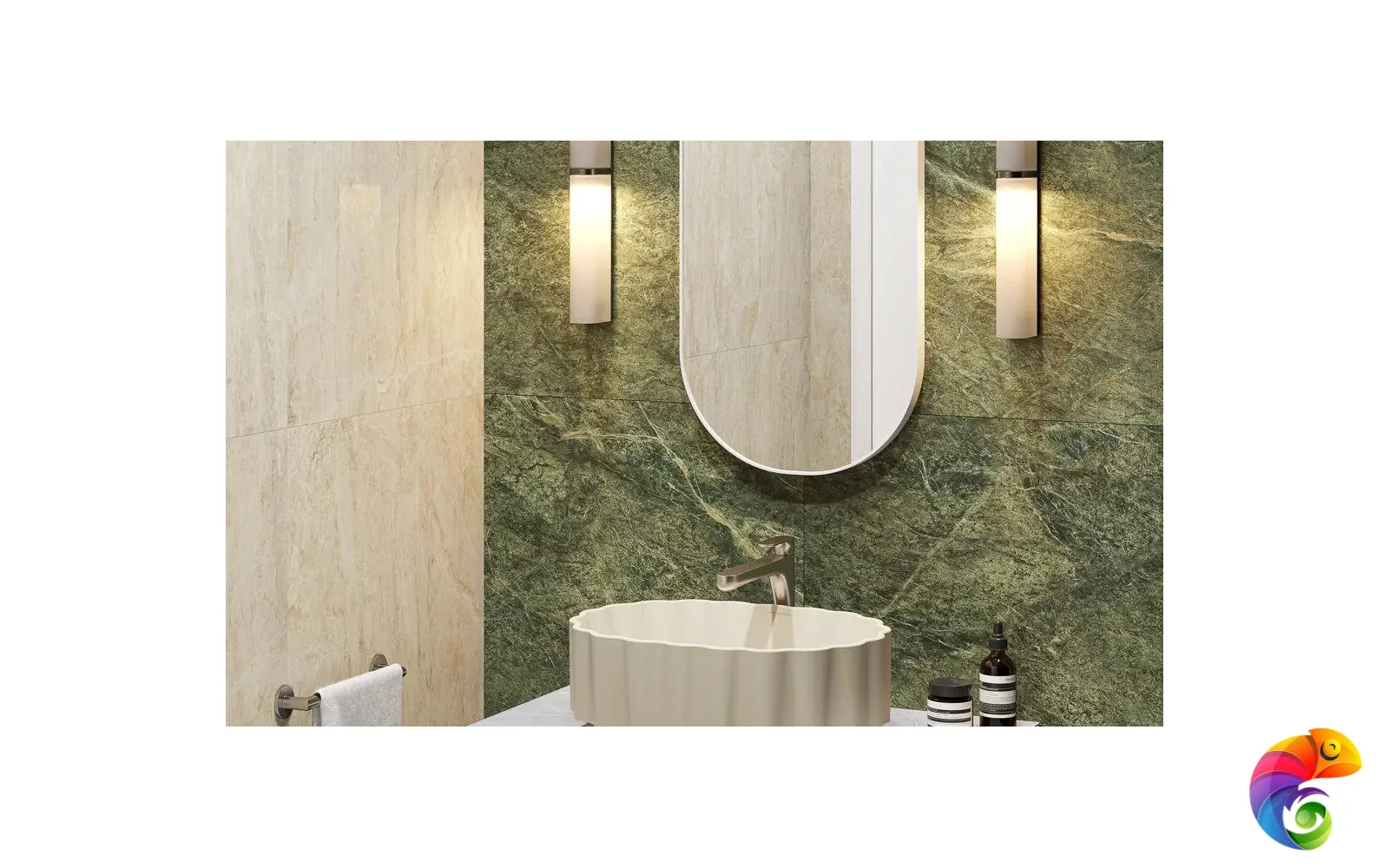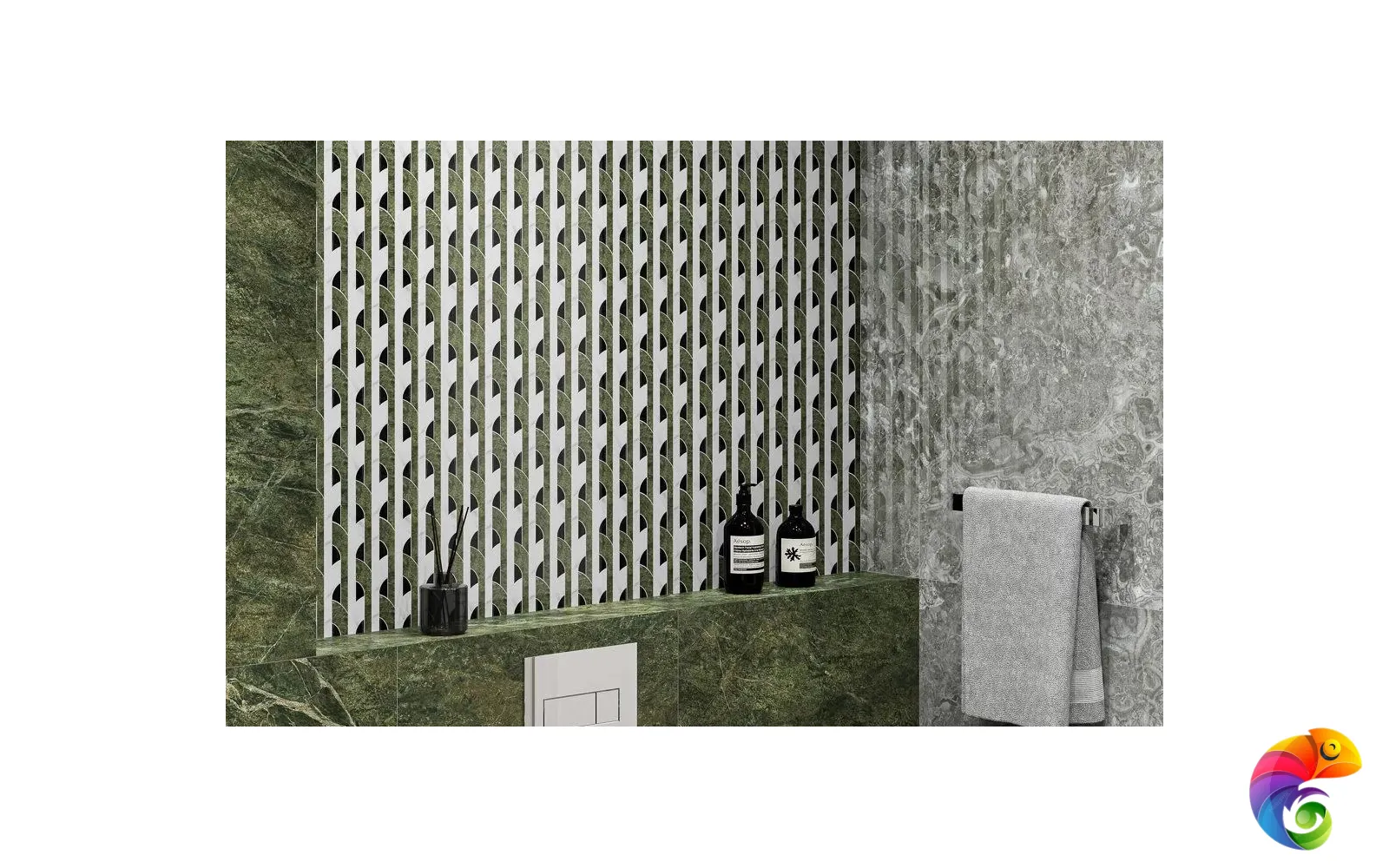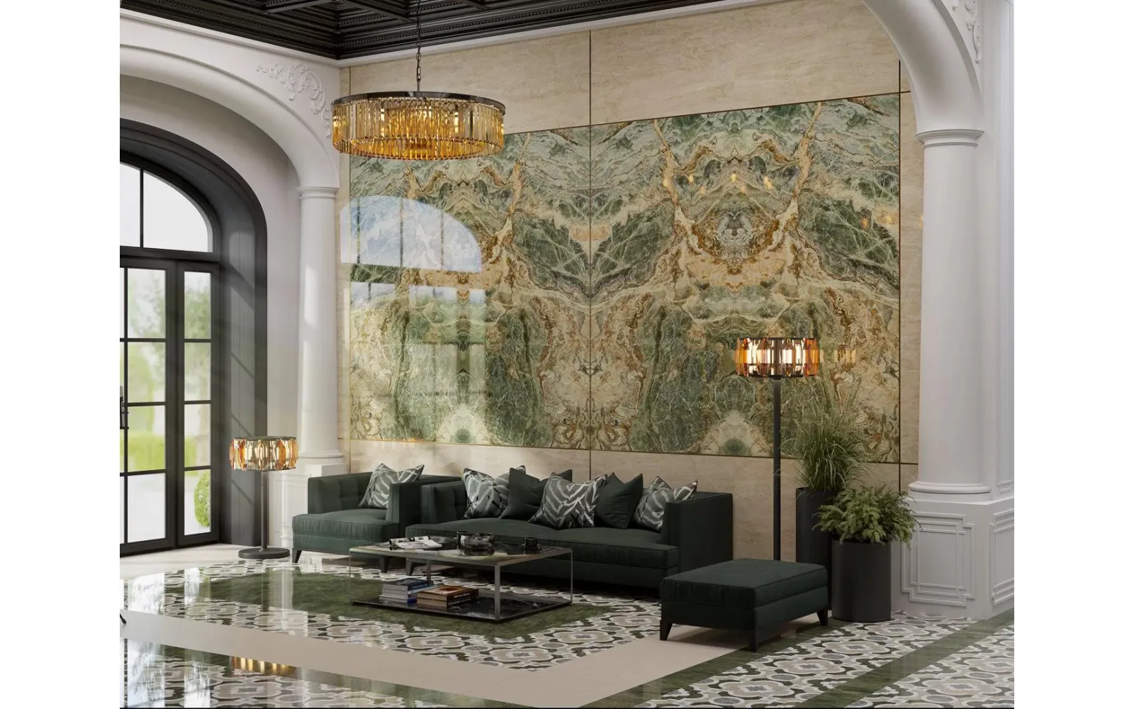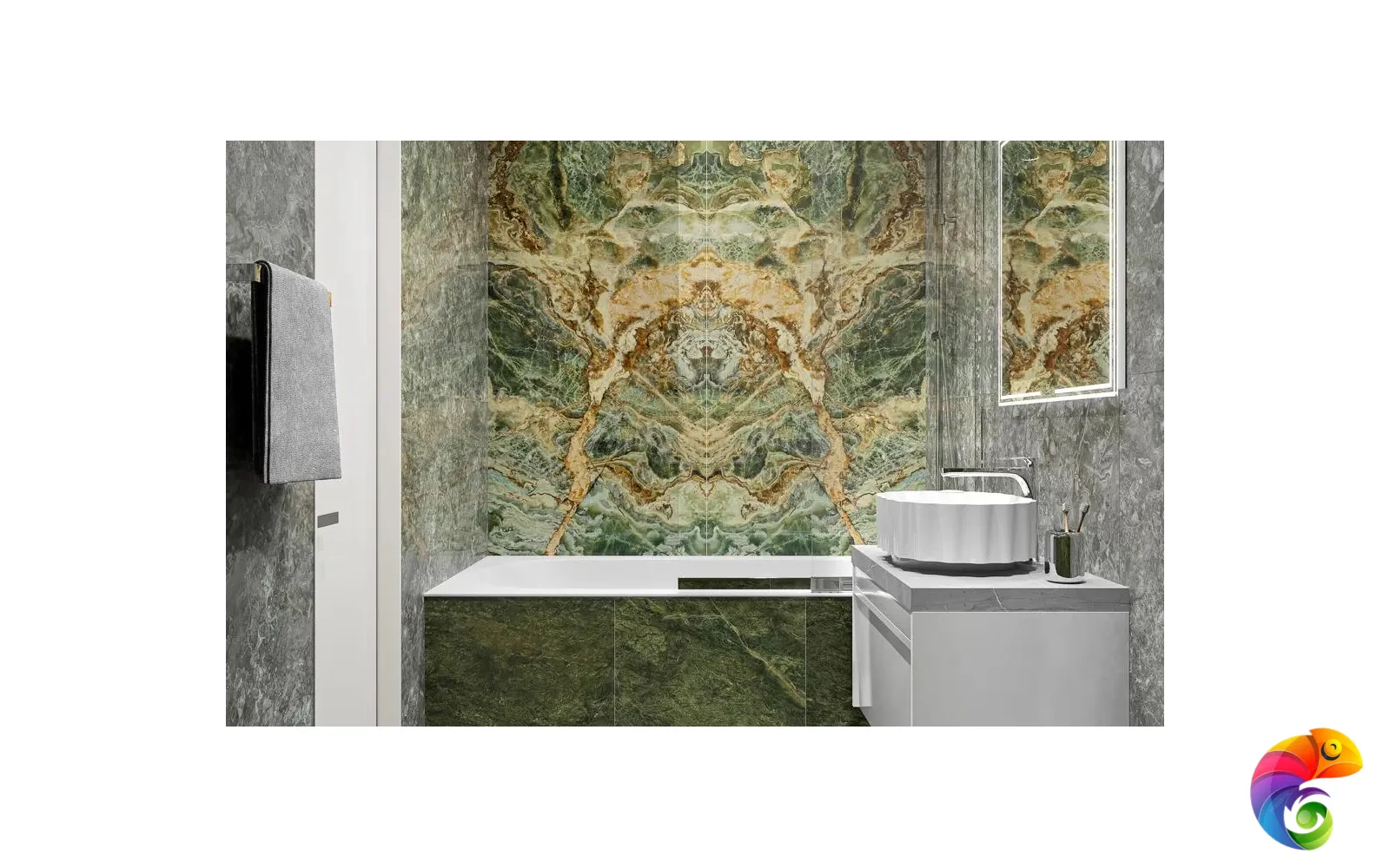 В МАКСИ-формате 119,5×238,5 представлен зелёный декор из двух панелей, образующих симметричную раскладку. Такую специалисты называют «бабочкой»: в случае натурального материала получить подходящие мраморные слэбы для подобного узора — большая удача, а с керамогранитом добиться впечатляющего результата можно в 100% случаев.