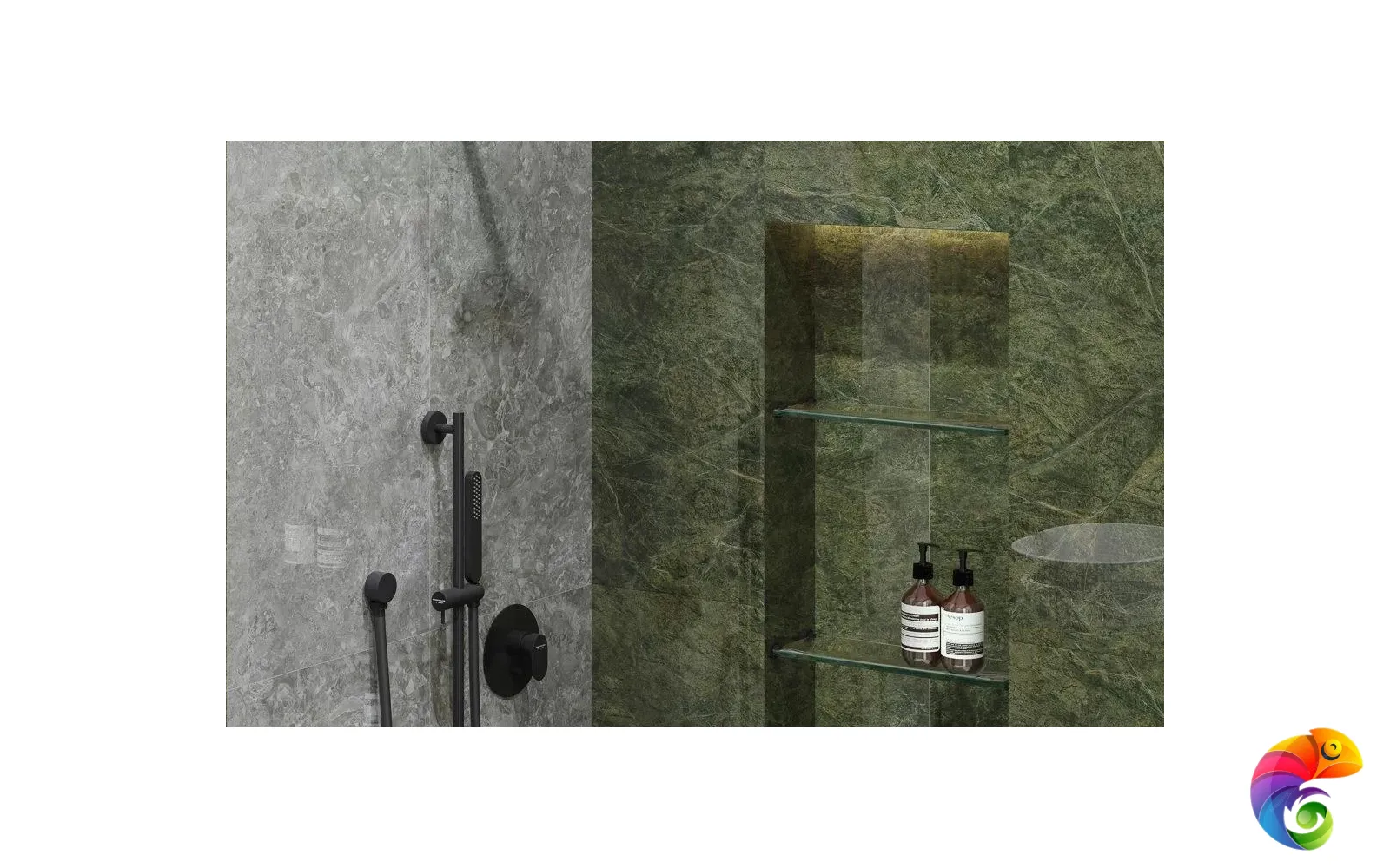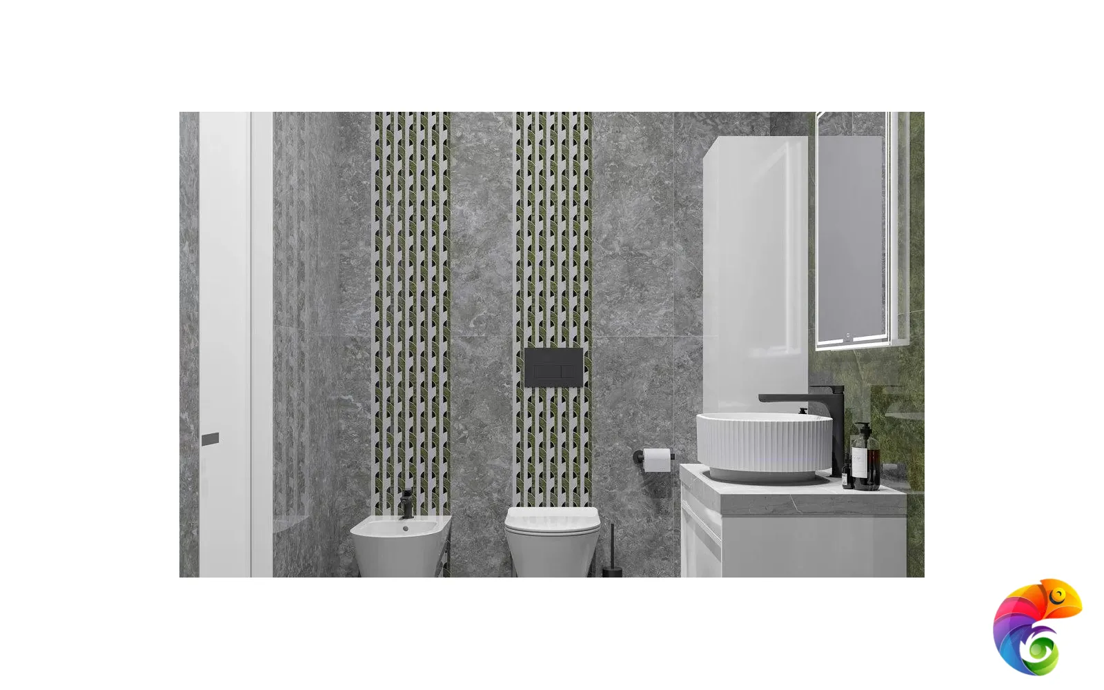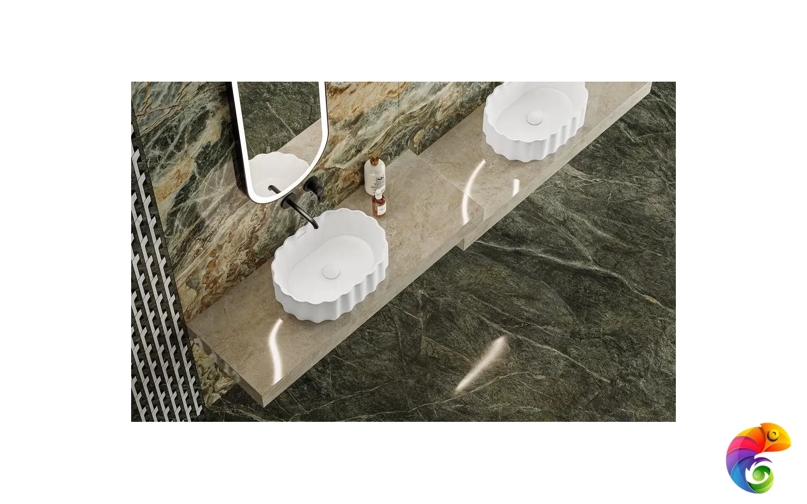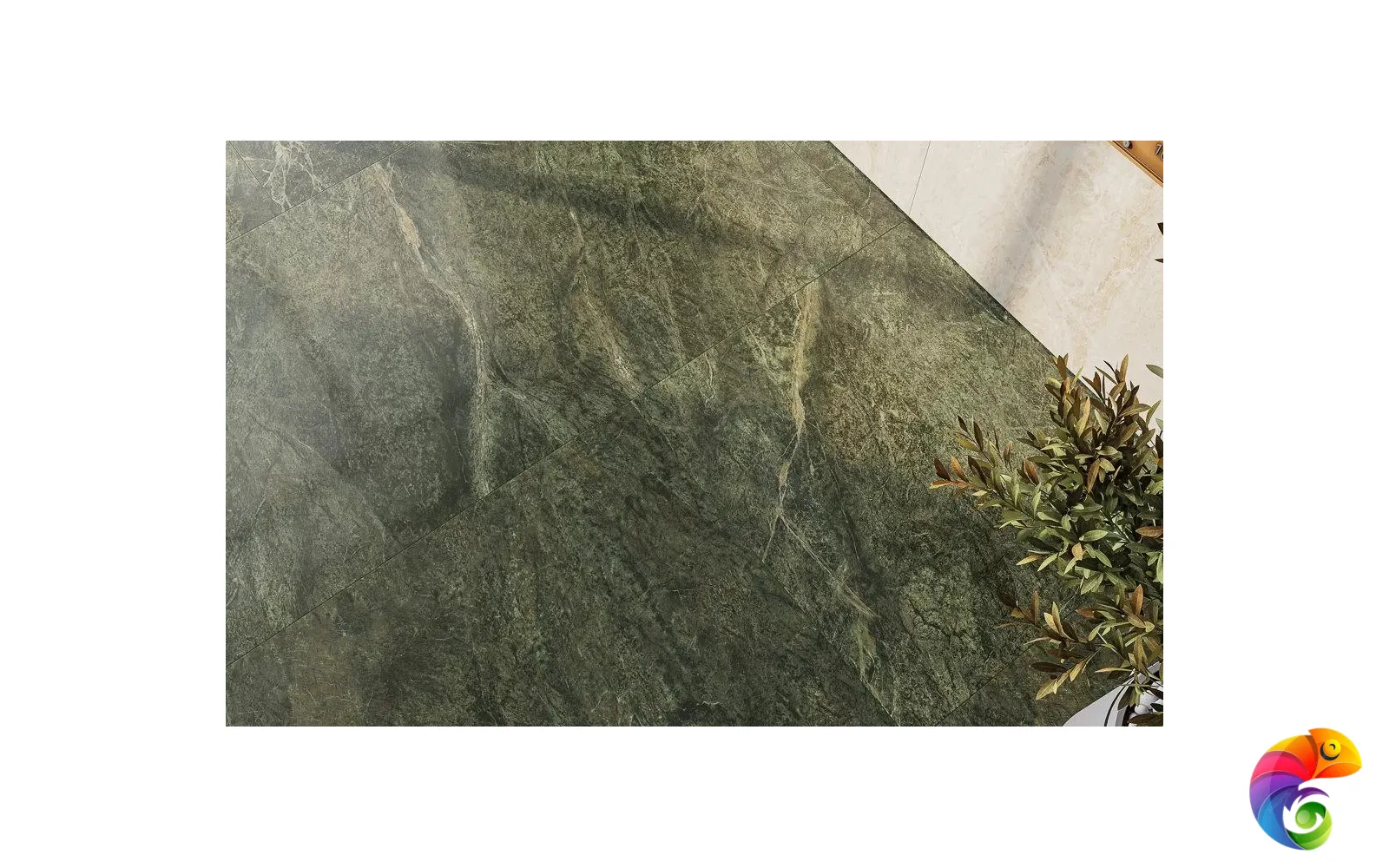 В МАКСИ-формате 119,5×238,5 представлен зелёный декор из двух панелей, образующих симметричную раскладку. Такую специалисты называют «бабочкой»: в случае натурального материала получить подходящие мраморные слэбы для подобного узора — большая удача, а с керамогранитом добиться впечатляющего результата можно в 100% случаев.