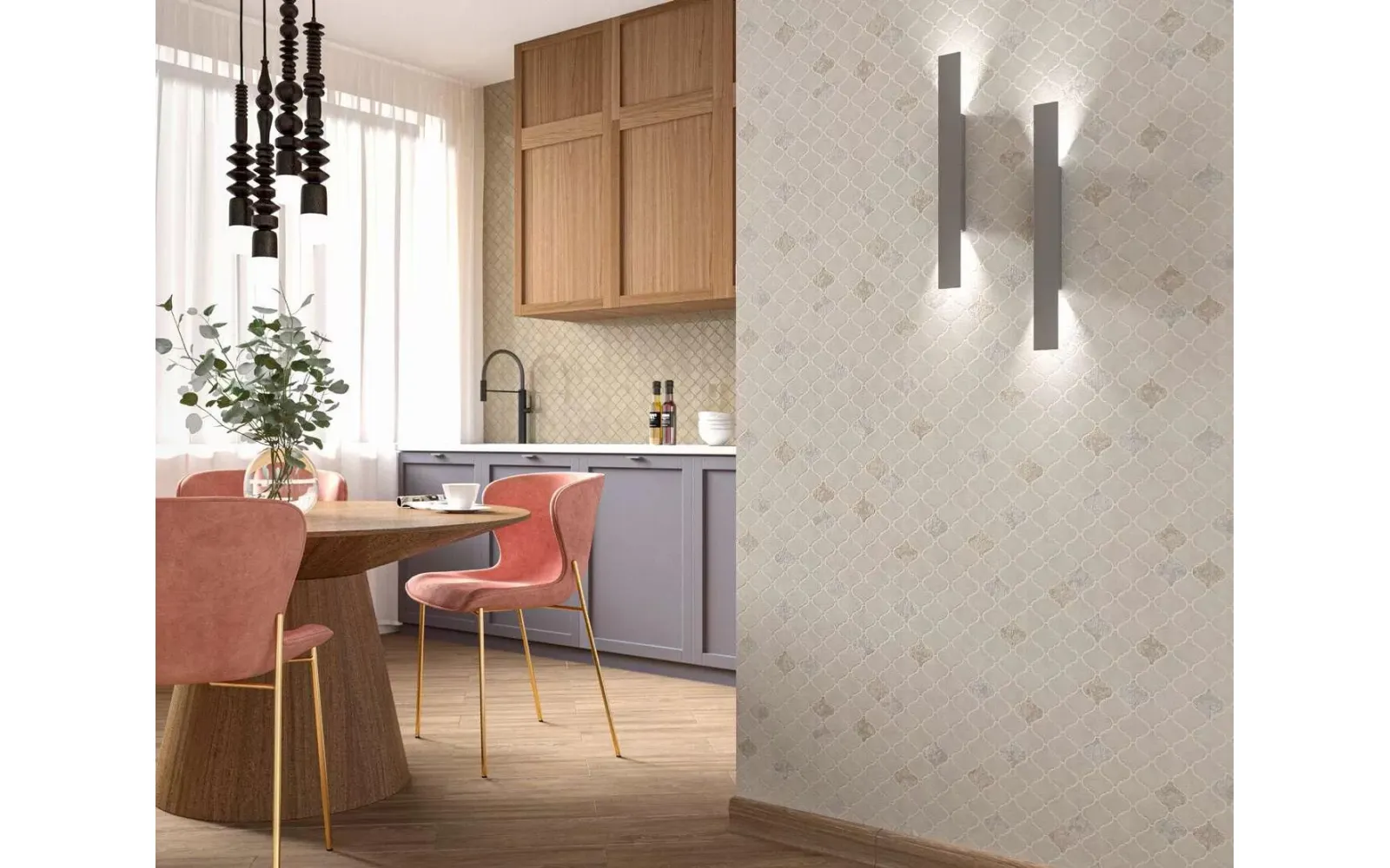 Арабески, заслужившие любовь в керамической мозаике, теперь доступны и в варианте обоев. В некоторых элементах узора заметен эффект кракле — краска словно потрескалась от времени.