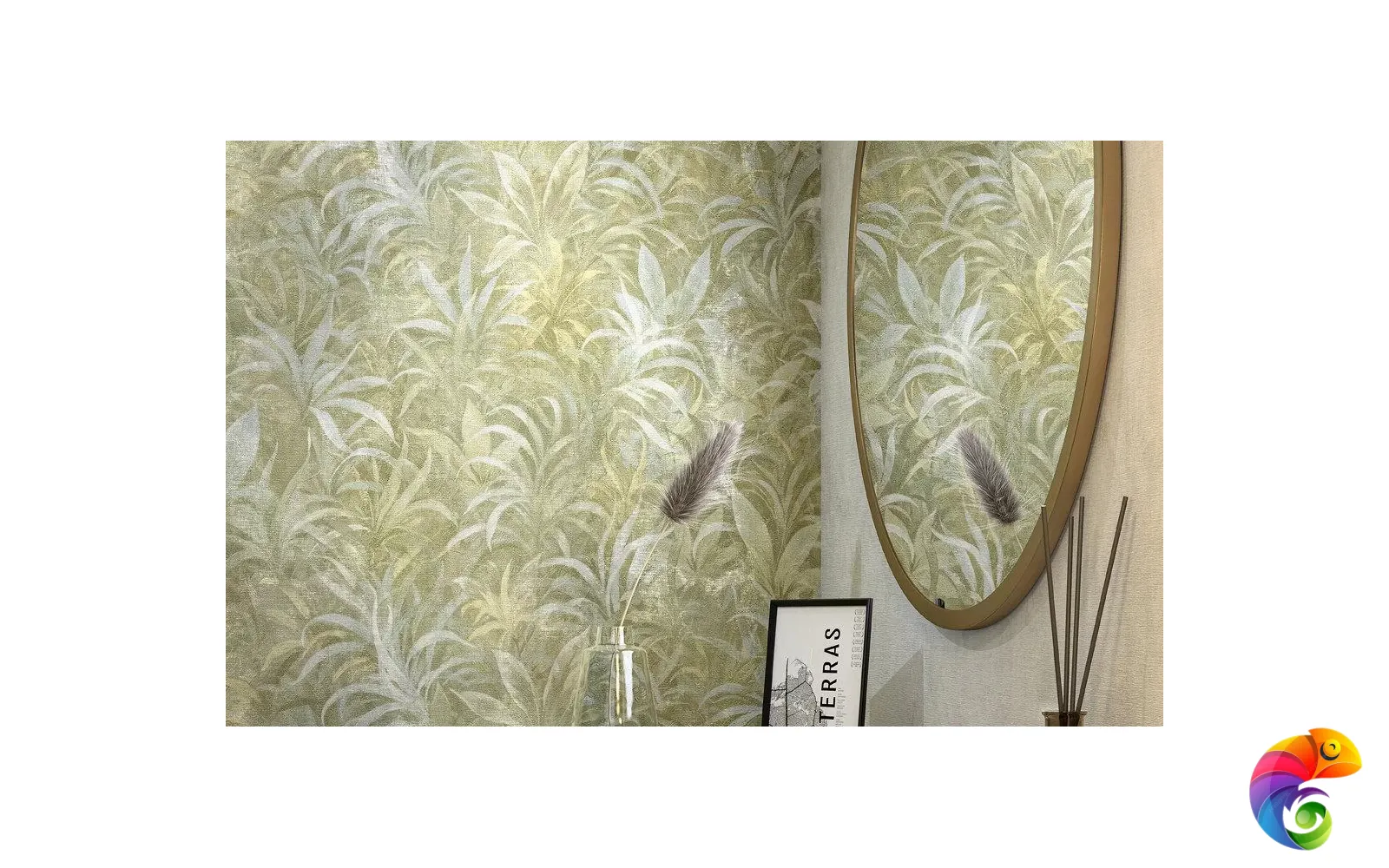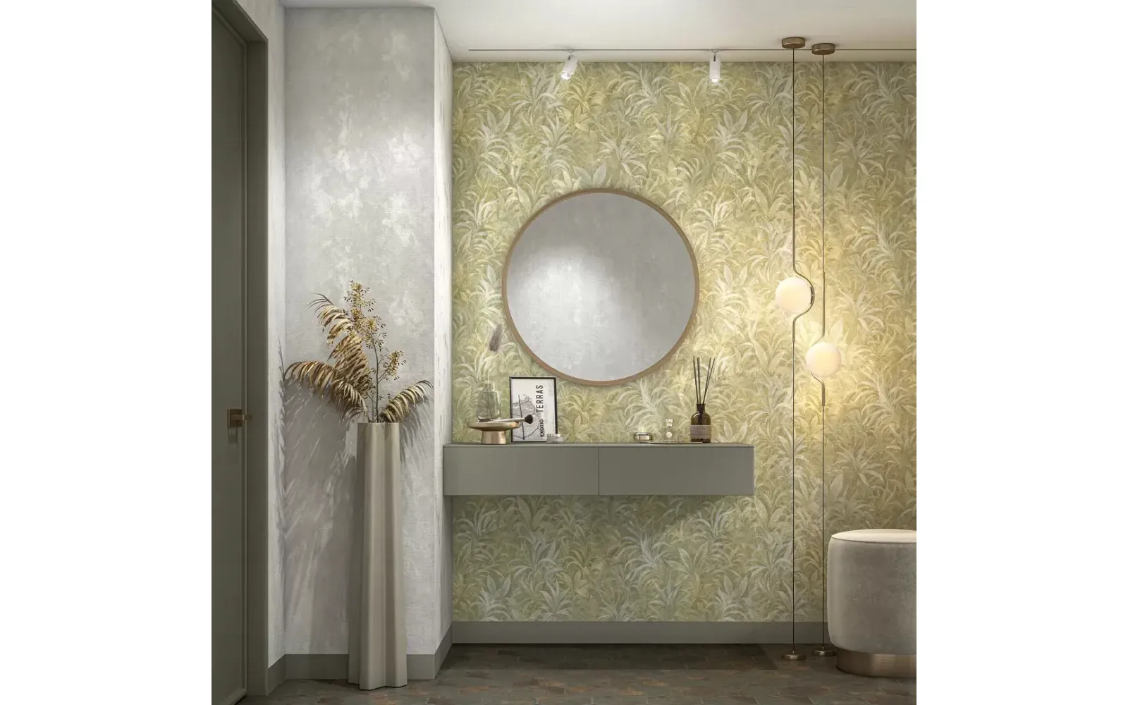 Экзотическая листва словно нарисована пастельными мелками на холсте с деликатным тиснением. Можно предпочесть более тёмный вариант мотива — или тот, который выполнен на светлом фоне.