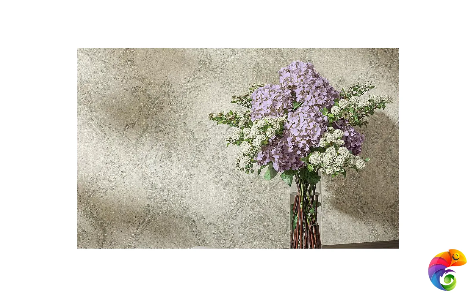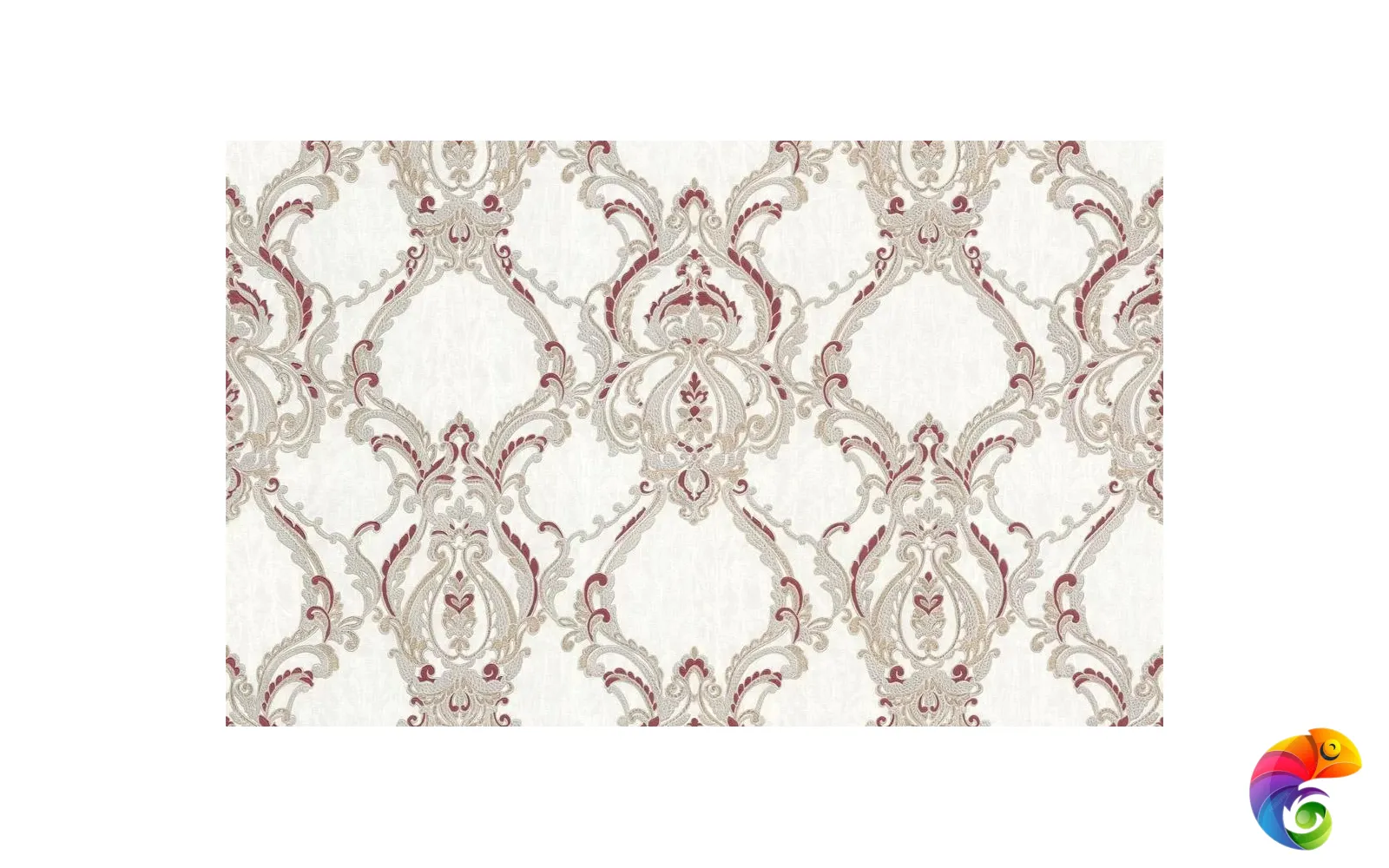 Из пяти мотивов четыре выполнены с матовой поверхностью, при этом сам узор деликатно переливается серебром и перламутром. Цветовые сочетания варьируются от спокойных до контрастных, где сдержанный бежевый соседствует с благородным бордовым. Пятый вариант мотива, выдержанный в оттенках зелёного, на стене будет смотреться наиболее ярко за счёт блестящей поверхности с вкраплениями золота.