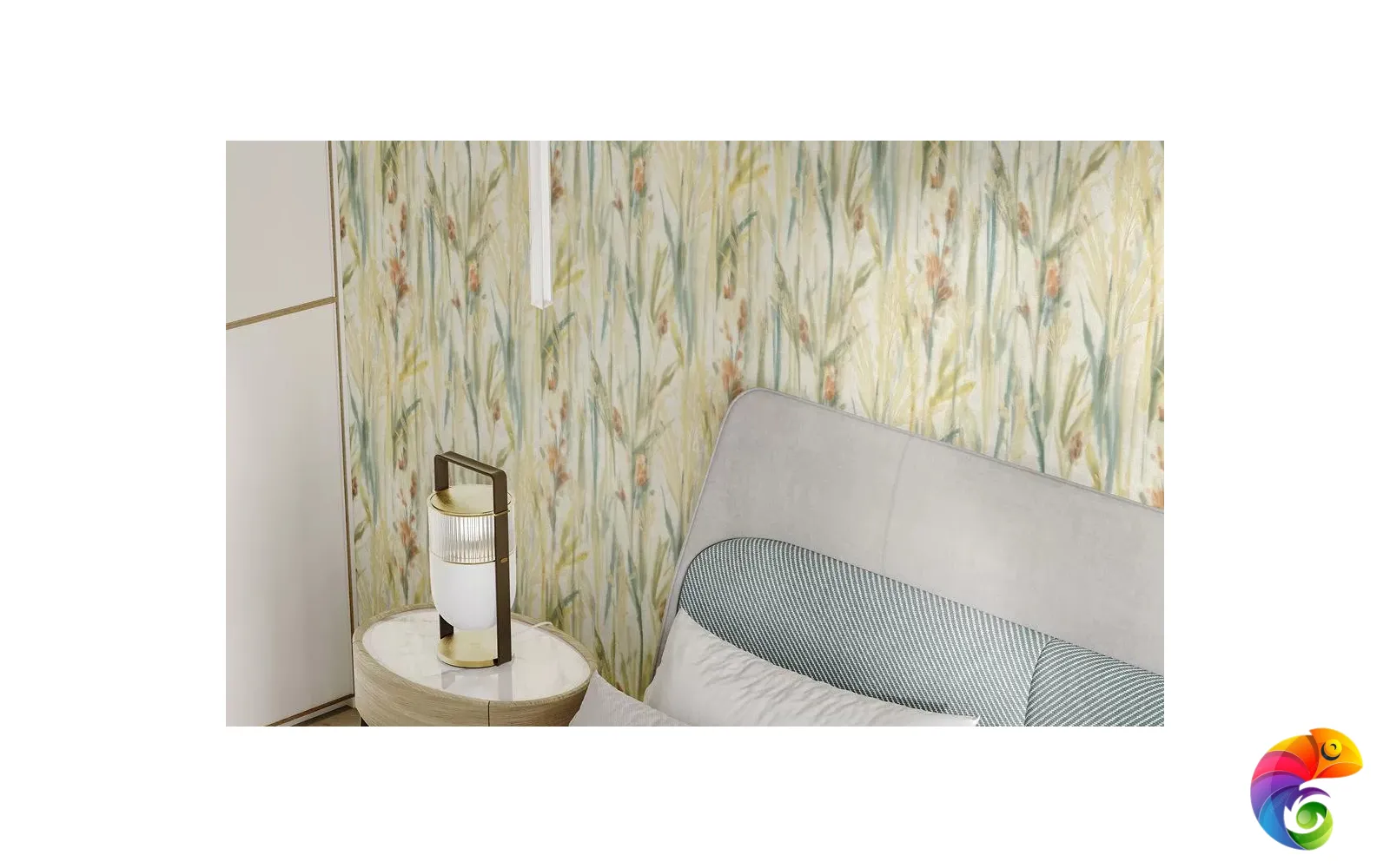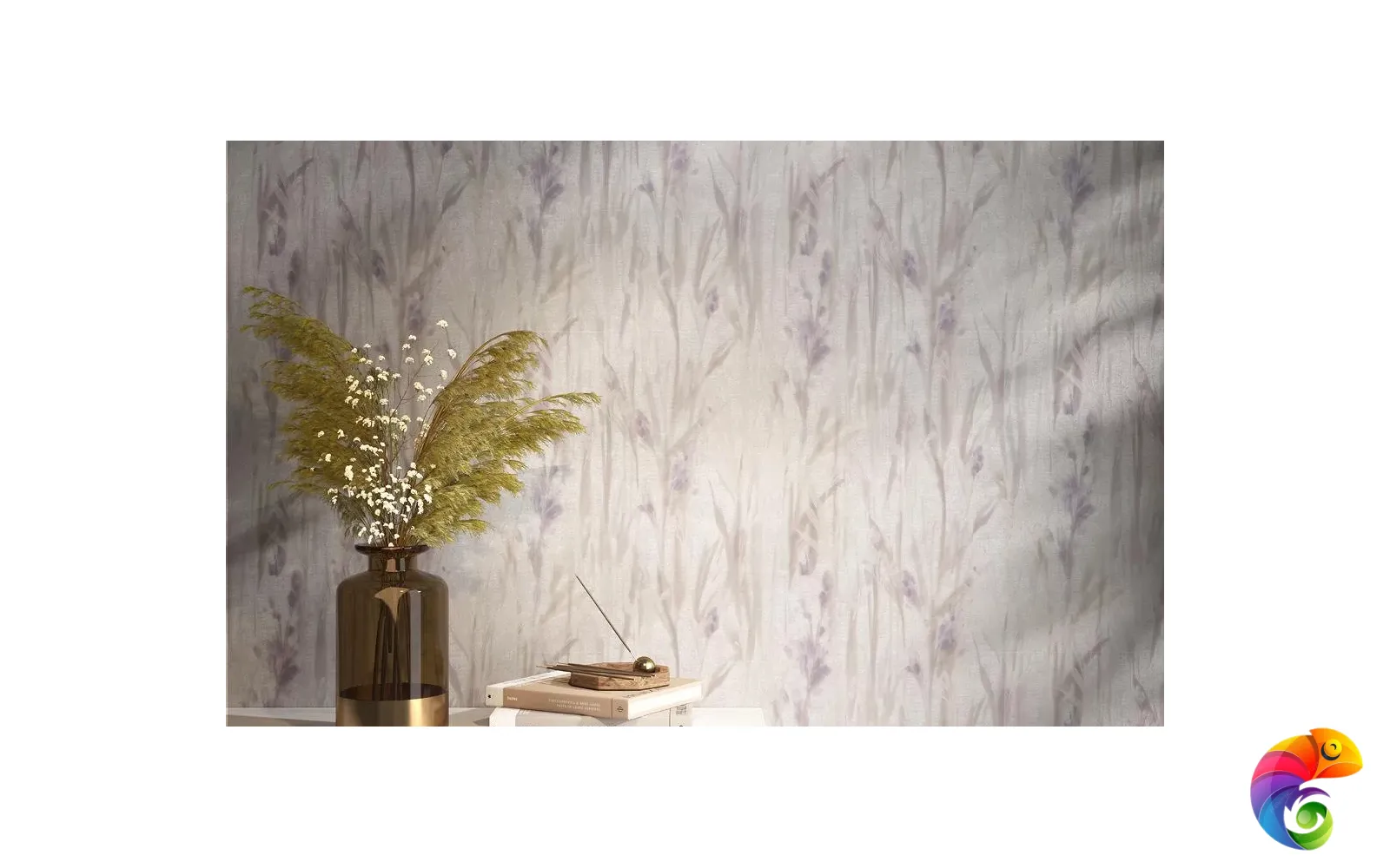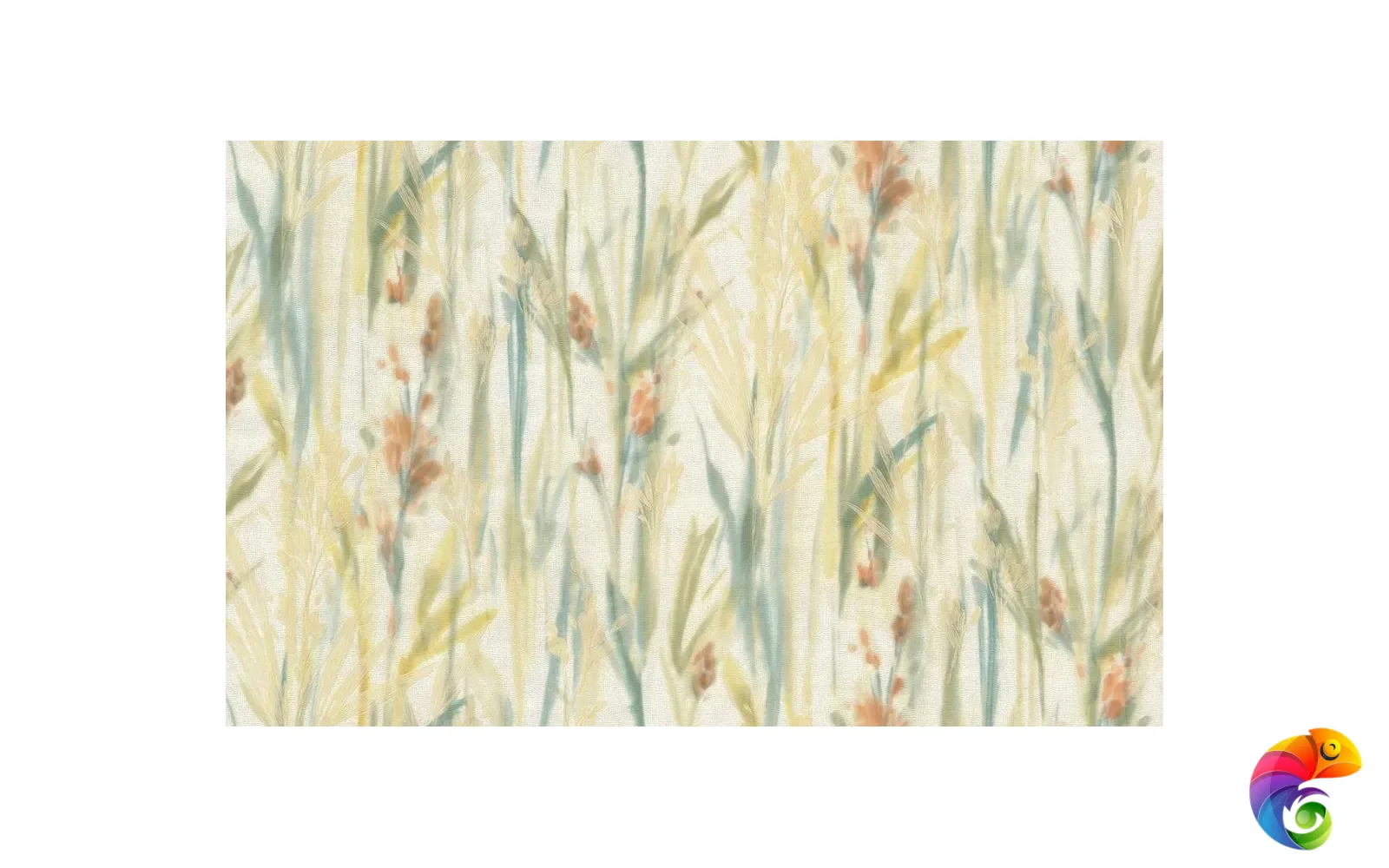 Флористический сюжет мотивов решён в акварельной стилистике. Фантазийные цветы, похожие на гладиолусы, на стене образуют живописное поле в цветовой гамме, содержащей несколько оттенков.