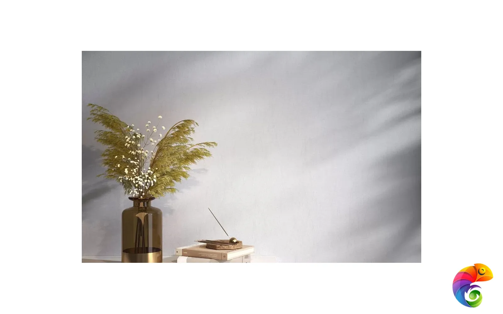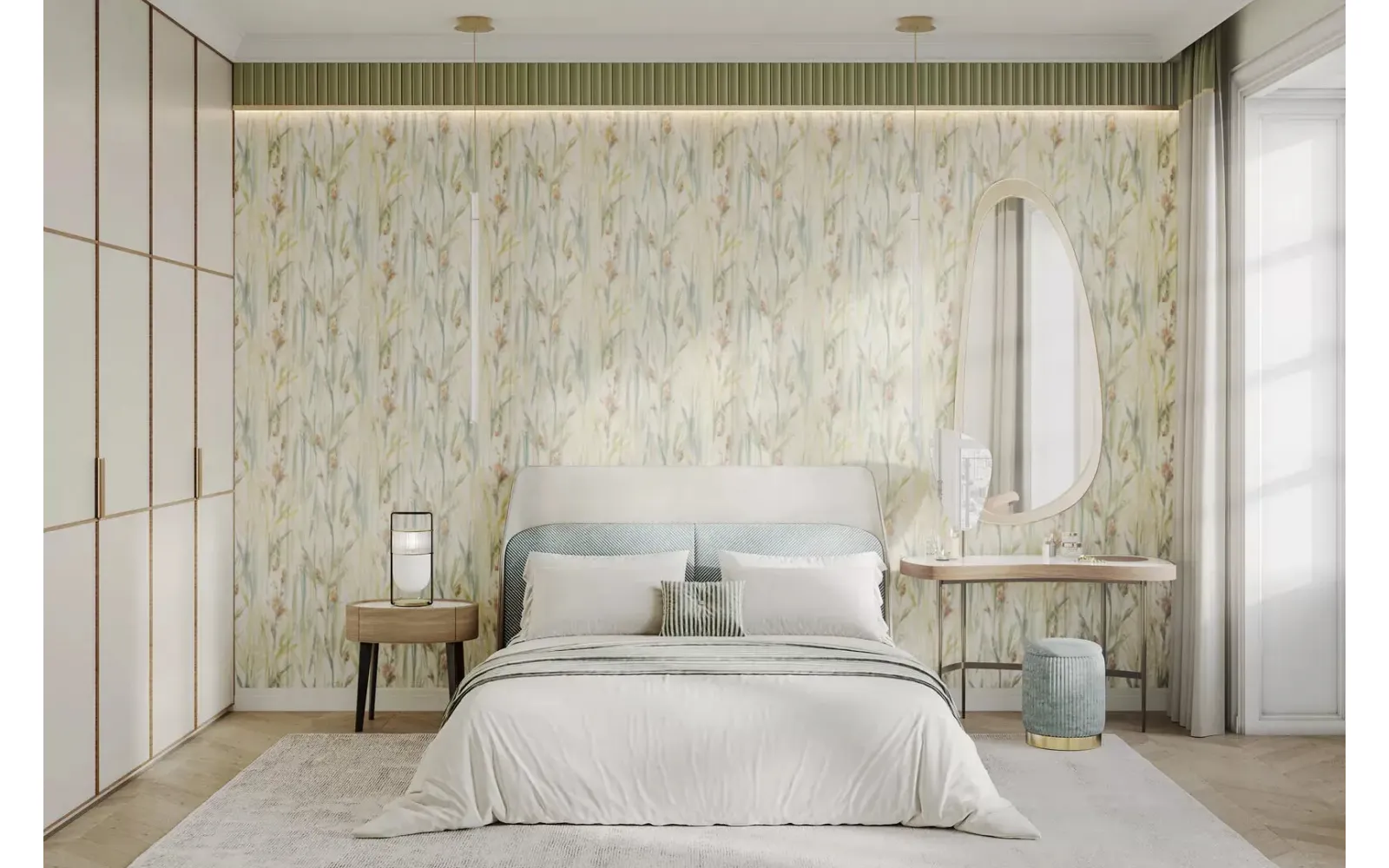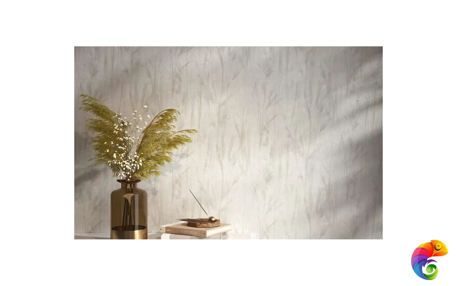 Флористический сюжет мотивов решён в акварельной стилистике. Фантазийные цветы, похожие на гладиолусы, на стене образуют живописное поле в цветовой гамме, содержащей несколько оттенков.