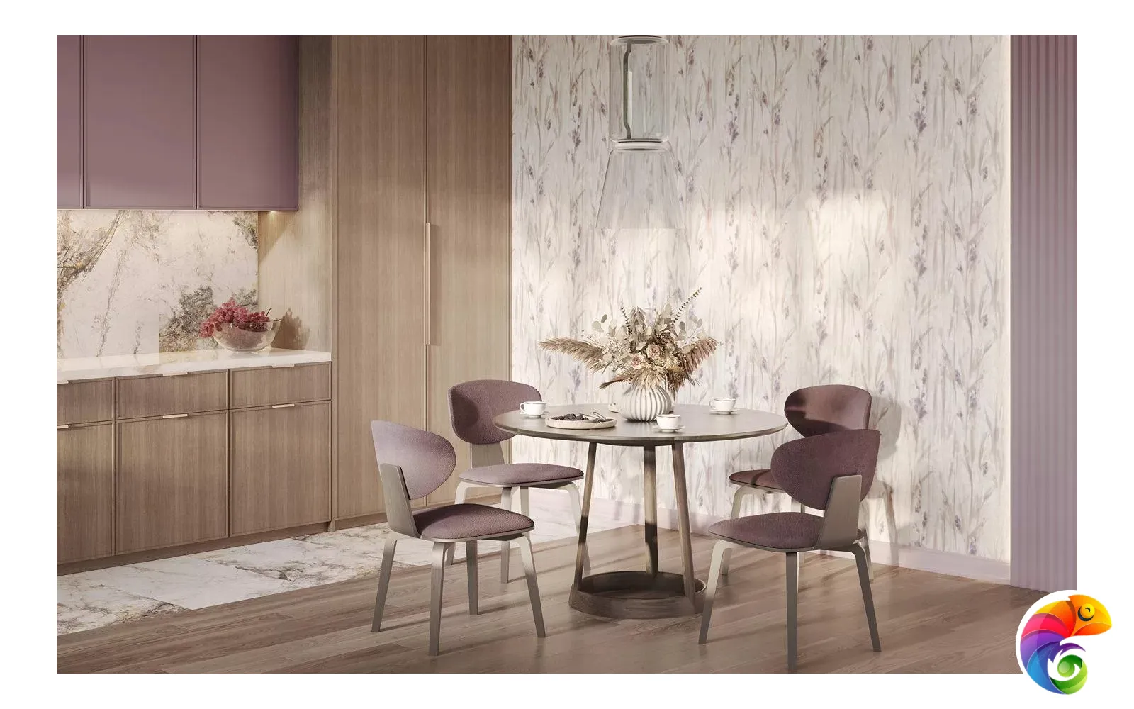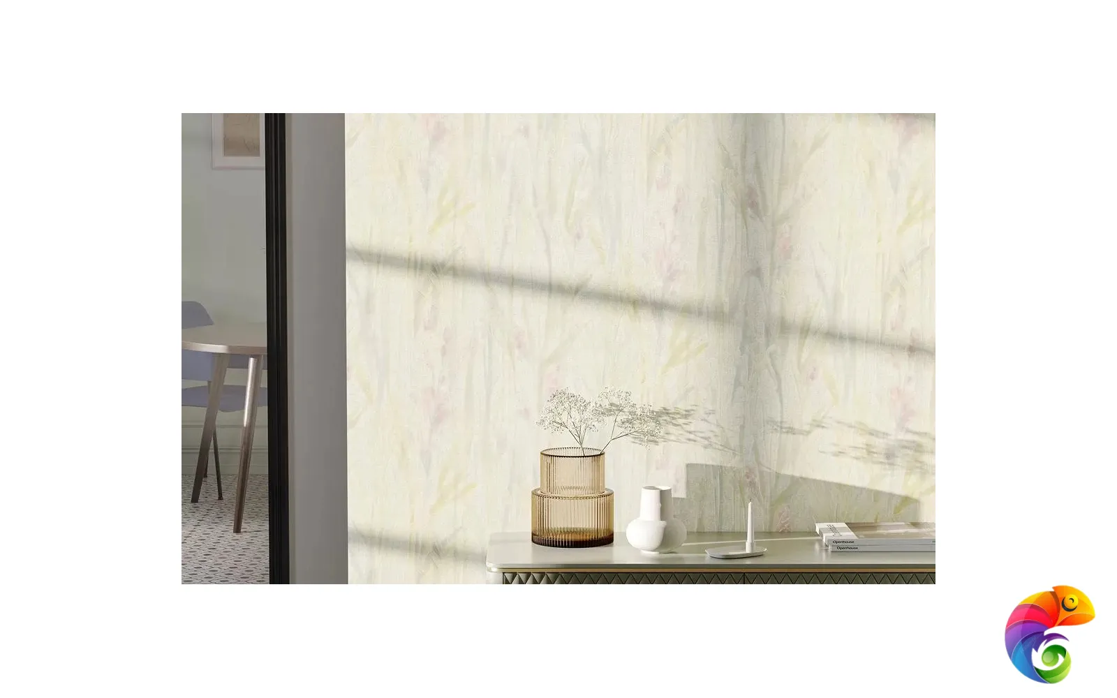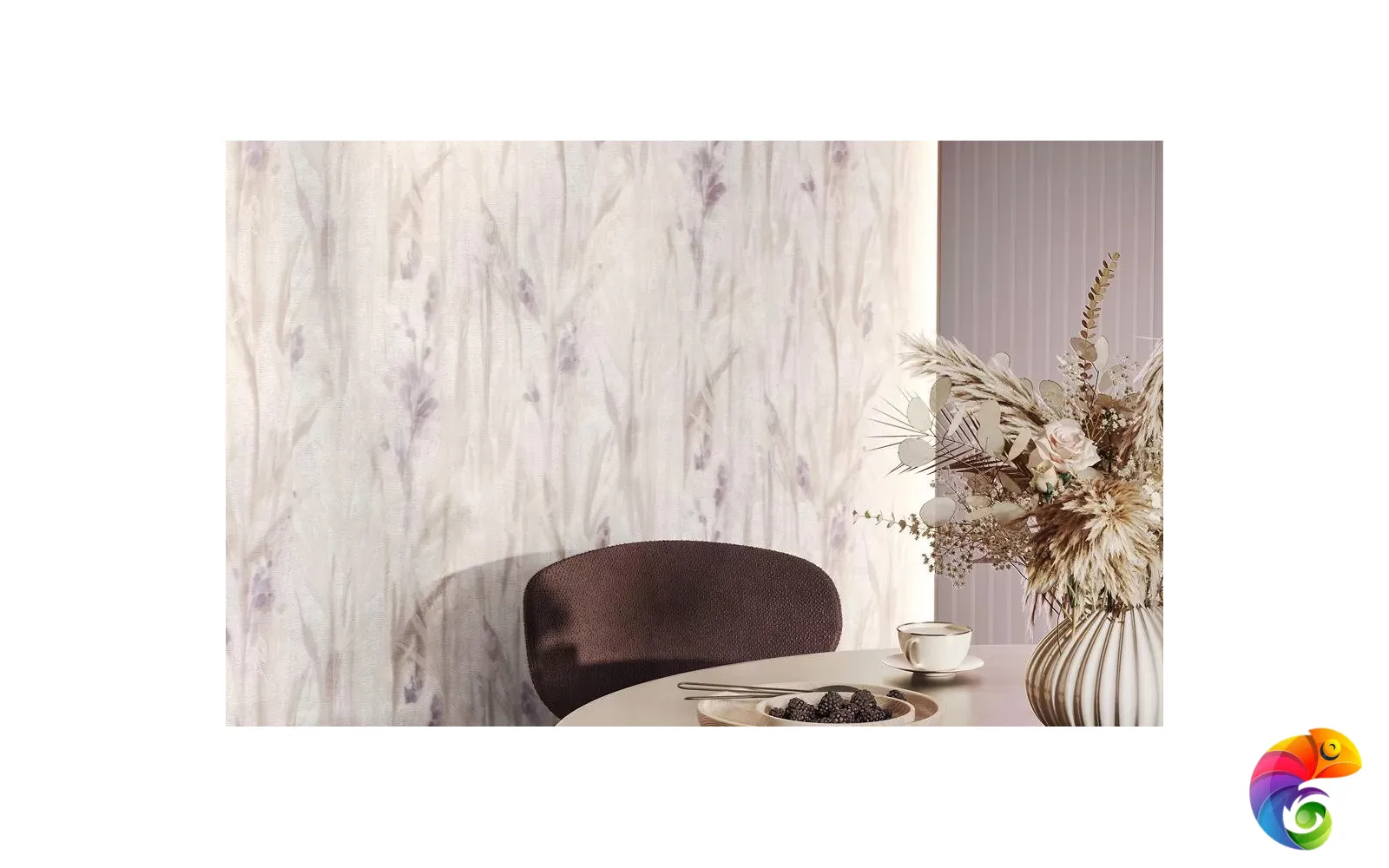 Помимо артикулов со светлым фоном, в серии есть и более насыщенные варианты, в том числе с сиреневыми тонами: они созвучны палитре раннего утра или подёрнутых туманом сумерек. Все обои представлены в матовом исполнении.