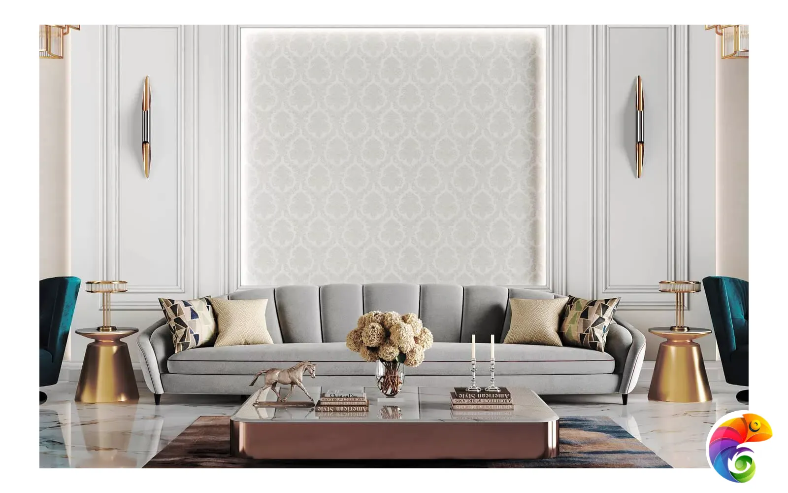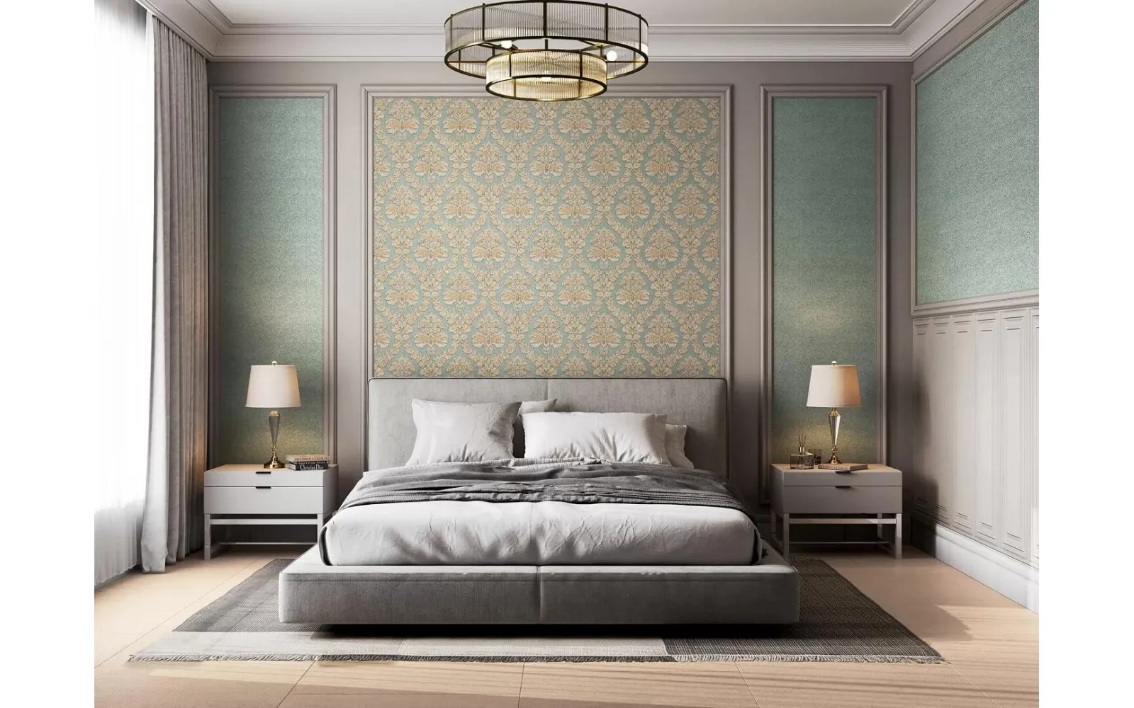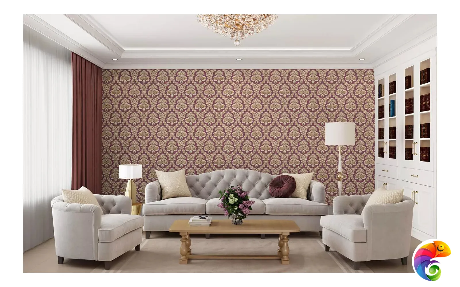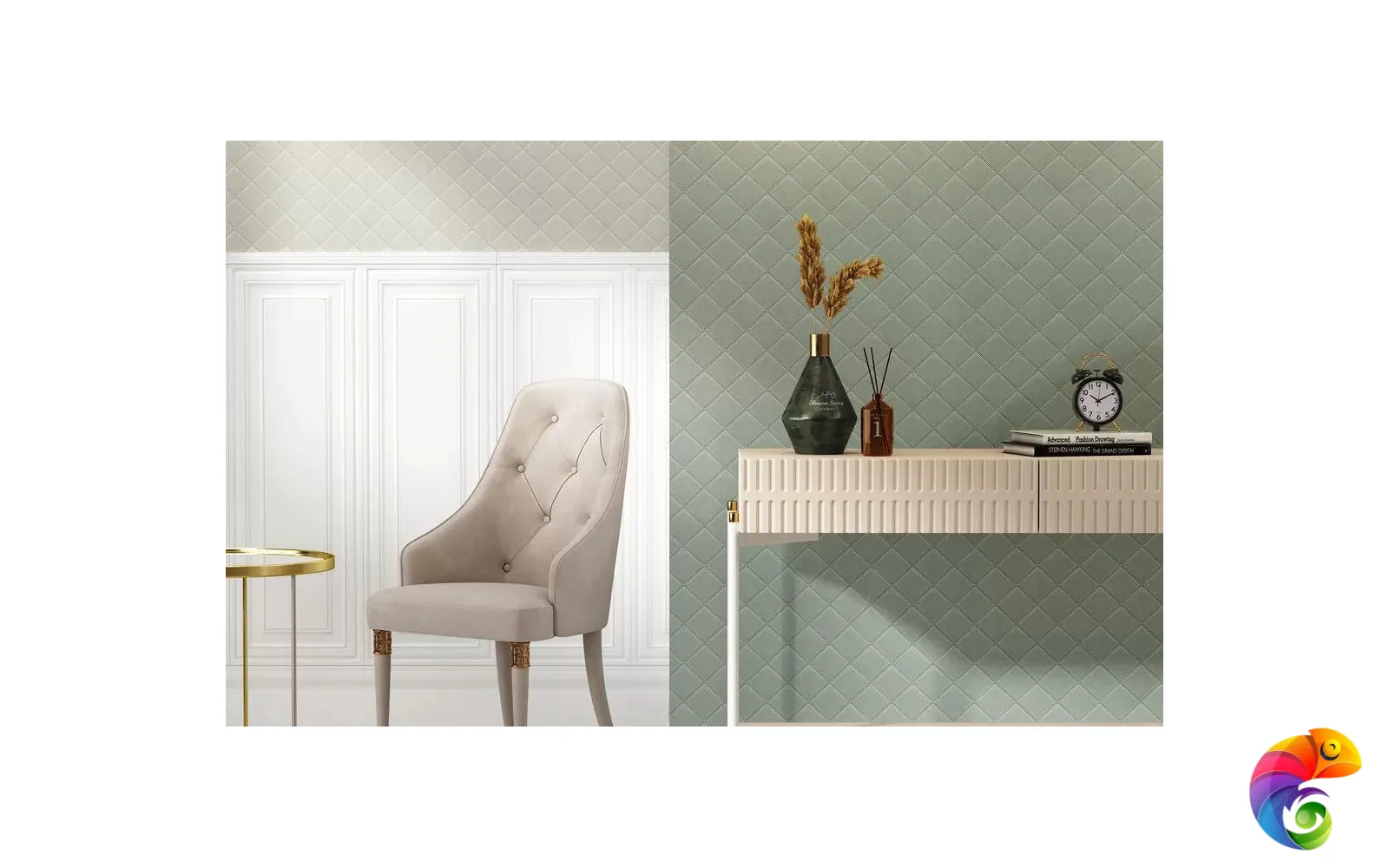Обои «Палаццо» вдохновлены красотой дворцовых покоев. В мотиве использован знаменитый дамасский узор с крупными цветами. Богатое тиснение придаёт им объём, а на поверхности сверкают золотые блики. Это великолепие отлично дополняют фоновые обои в двух исполнениях. Первое воспроизводит структуру капитоне, уместную в классическом и современном дизайне. Ещё один вариант фона – обои с мелкой текстурой благородного твида, в нескольких оттенках.
