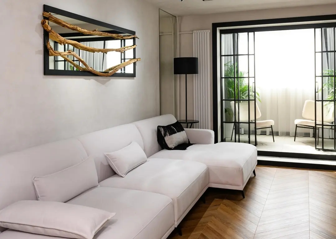 Команда проекта проделала большую работу, результат которой поистине можно назвать безупречным. Интерьер комнаты выполнен в минималистичном стиле с использованием светлых и темных тонов, создавая гармоничный интерьер, где каждая деталь имеет смысл. Игра света достигается за счет контрастных черных трековых светильников на светлом потолке. Напольная лампа с абажуром и мягкий просторный диван служат дополнением для создания домашней атмосферы. Лоджия теперь изящно отделена в зону с креслами и зелеными растениями.